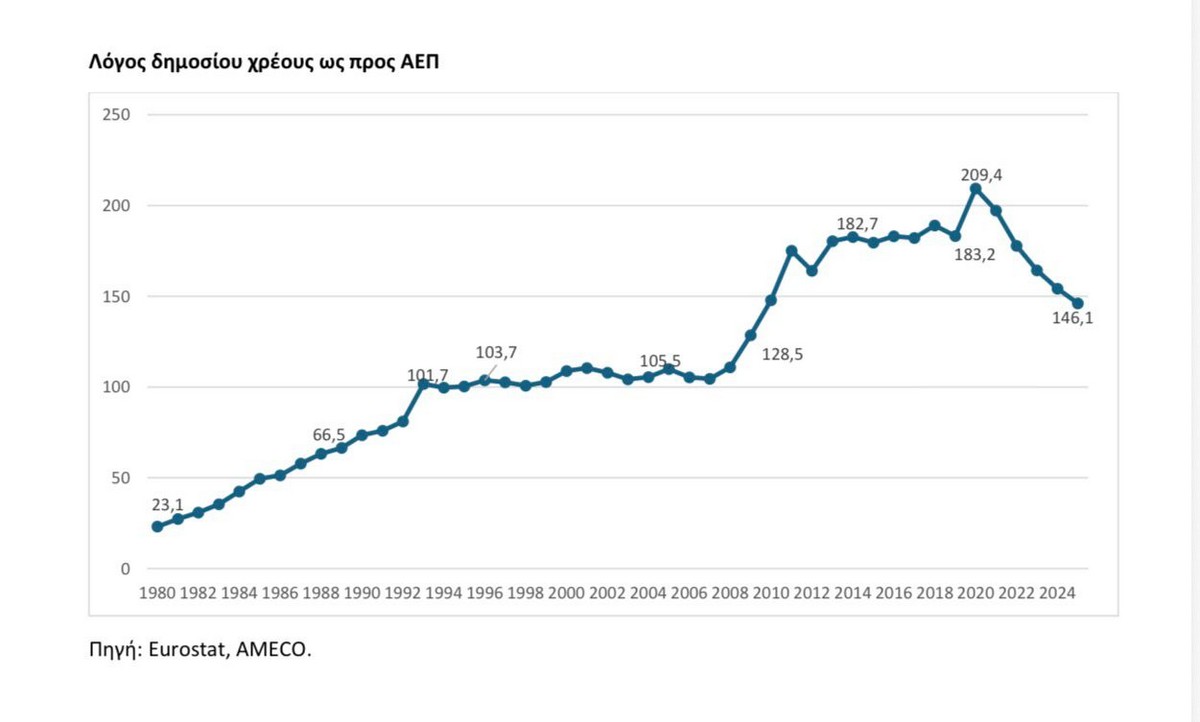 Ωστόσο, στο τέλος του 2025, ο λόγος χρέους προς ΑΕΠ περιορίστηκε στο 146,1%. Η υποχώρηση αυτή, ύψους σχεδόν 67 ποσοστιαίων μονάδων εντός τετραετίας, επιτεύχθηκε παρά τις πιέσεις που δέχθηκε η οικονομία από τη διπλή ενεργειακή και εφοδιαστική κρίση που πυροδότησε η εισβολή της Ρωσίας στην Ουκρανία.