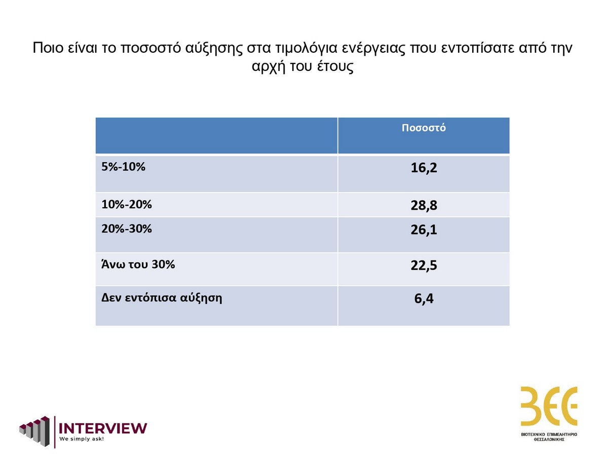 Πιο συγκεκριμένα στην ερώτηση «ποιο είναι το ποσοστό αύξησης στα τιμολόγια ενέργειας που εντοπίσατε από την αρχή του έτους;» το 28,8% απάντησε από 10% έως 20%, το 26,1% από 20% έως 30%, το 22,5% άνω του 30%, το 16,2% από 5% έως 10% ενώ το 6,4% δεν διαπίστωσε κάποια αύξηση.
