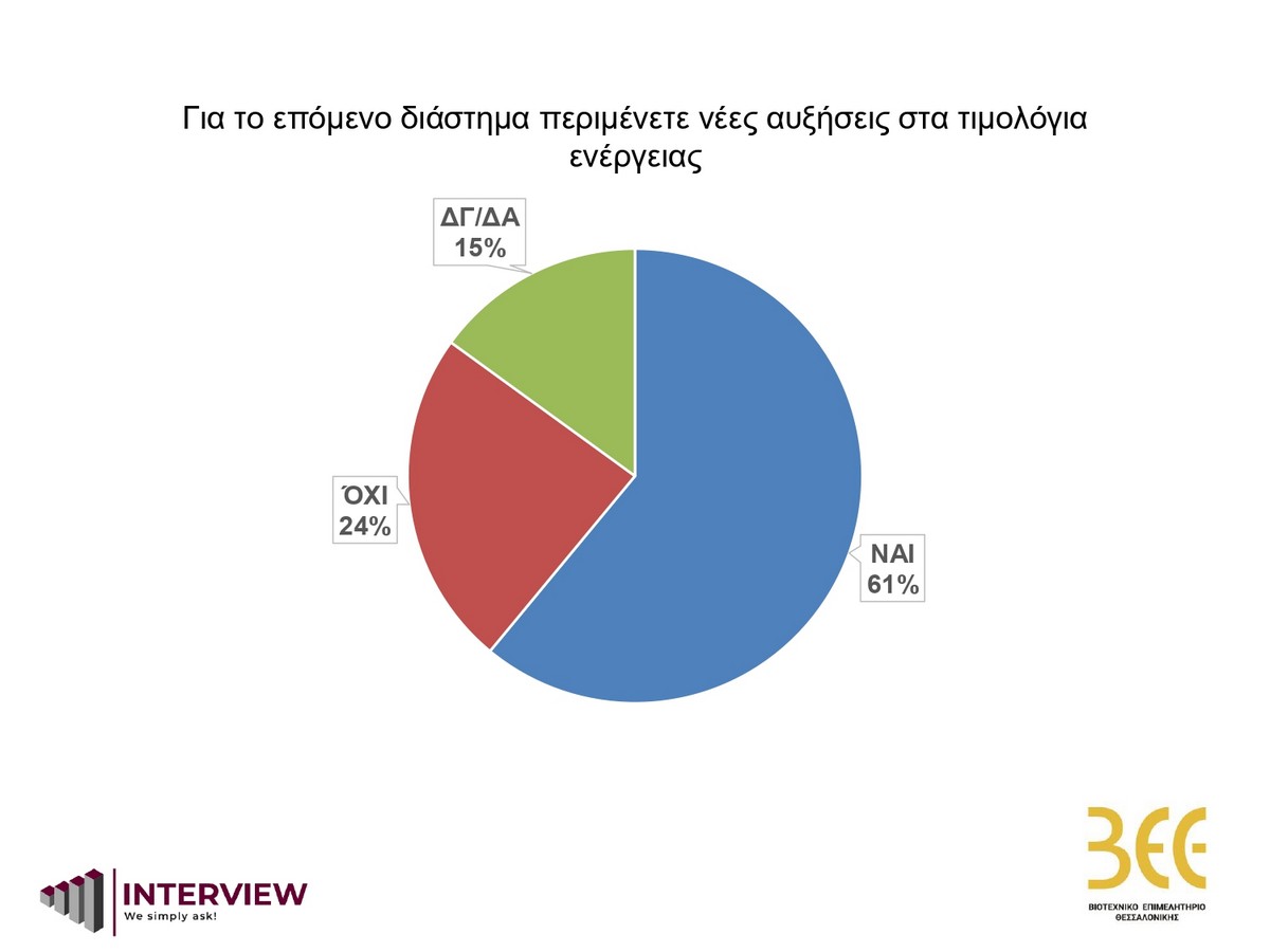 Νέες αυξήσεις στα τιμολόγια ενέργειας περιμένει το 61%, αντίθετη άποψη έχει το 24%, ενώ το 15% δήλωσε πως δεν γνωρίζει/δεν απαντά.