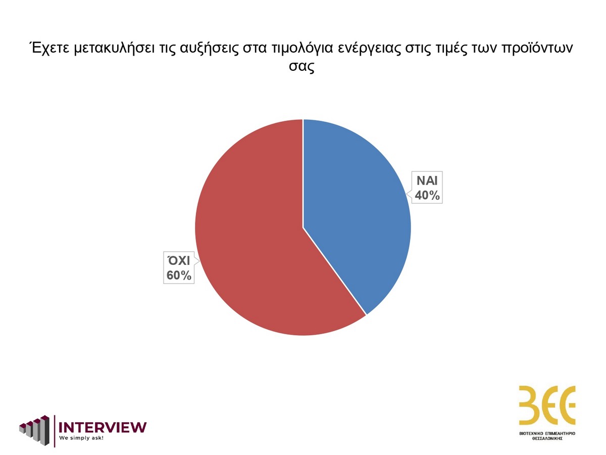 Πάντως παρά τις αυξήσεις στα τιμολόγια ενέργειας, 6 στους 10 βιοτέχνες λένε πως δεν τις μετακύλησαν στις τιμές των προϊόντων τους, ενώ 4 στους 10 απαντούν πως προχώρησαν σε ανατιμήσεις.