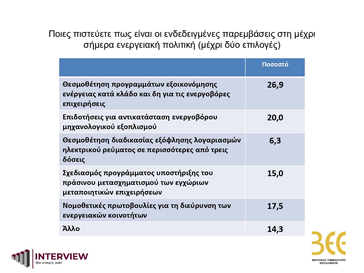 Στην ερώτηση «ποιες πιστεύετε πως είναι οι ενδεδειγμένες παρεμβάσεις στη μέχρι σήμερα ενεργειακή πολιτική;» το 26,9% επισημαίνει την ανάγκη θεσμοθέτησης προγραμμάτων εξοικονόμησης ενέργειας κατά κλάδο και δη για τις ενεργοβόρες επιχειρήσεις, το 20% θεωρεί αναγκαίες τις επιδοτήσεις για αντικατάσταση ενεργοβόρου μηχανολογικού εξοπλισμού, το 17,5% κρίνει απαραίτητες νομοθετικές πρωτοβουλίες για τη διεύρυνση των ενεργειακών κοινοτήτων, το 15% επικροτεί το σχεδιασμό προγράμματος υποστήριξης του πρασίνου μετασχηματισμού των εγχώριων μεταποιητικών επιχειρήσεων, το 6,3% τη θεσμοθέτηση διαδικασίας εξόφλησης λογαριασμών ηλεκτρικού ρεύματος σε περισσότερες από τρεις δόσεις, ενώ το 14,3% απάντησε «άλλο».