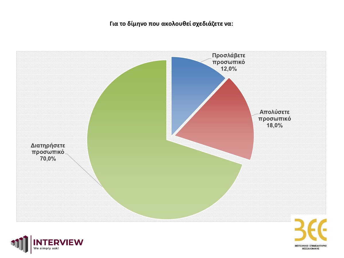 Το 70% απάντησε πως το επόμενο δίμηνο θα διατηρήσει το ανθρώπινο δυναμικό της επιχείρησης του, το 18% πως θα προσλάβει προσωπικό και το 12% πως θα απολύσει.