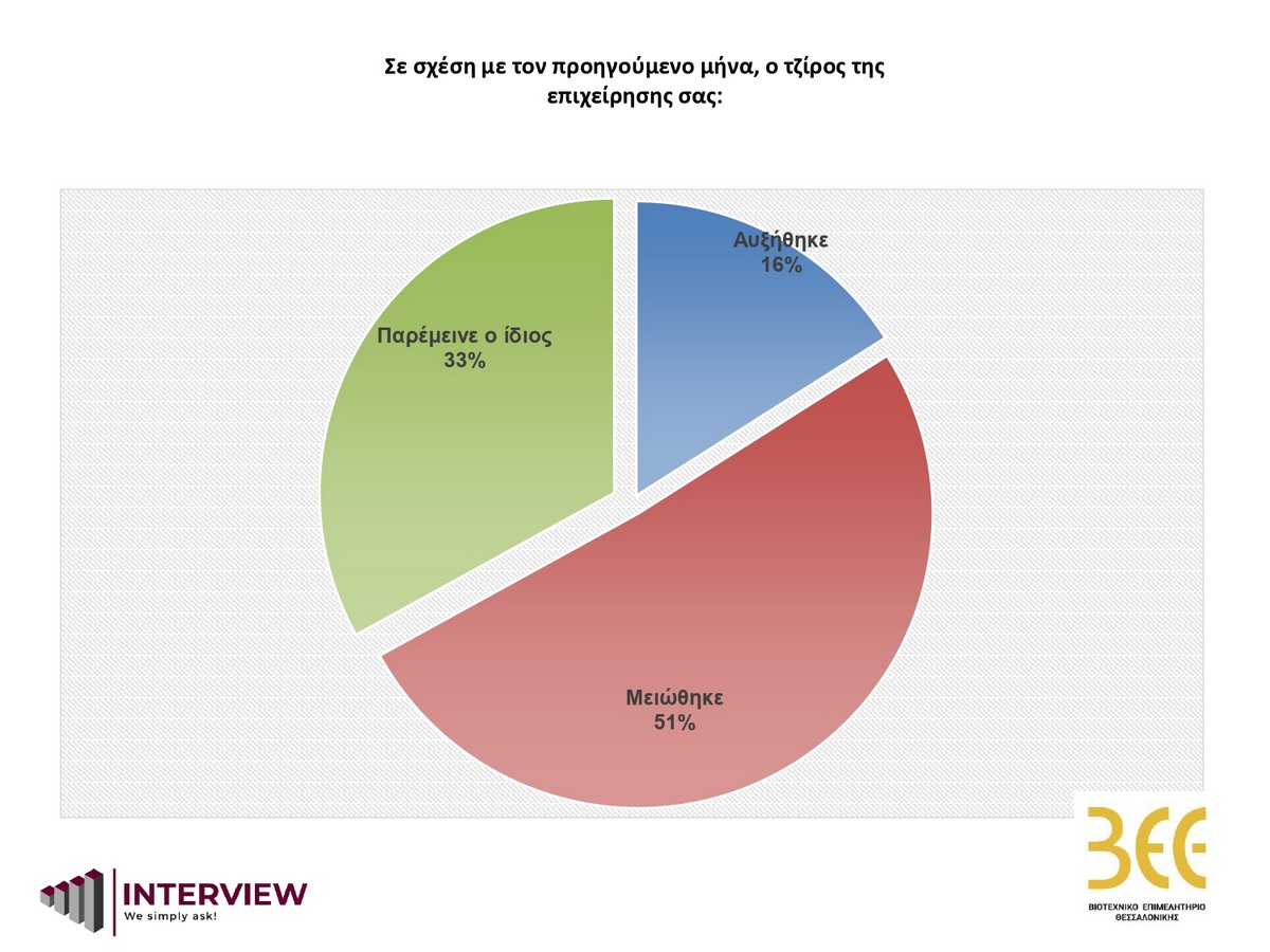 Το 51% των ερωτηθέντων δήλωσε πως ο τζίρος της επιχείρησης του εμφάνισε μείωση, το 33% πως παρέμεινε ίδιος, ενώ το 16% πως αυξήθηκε.