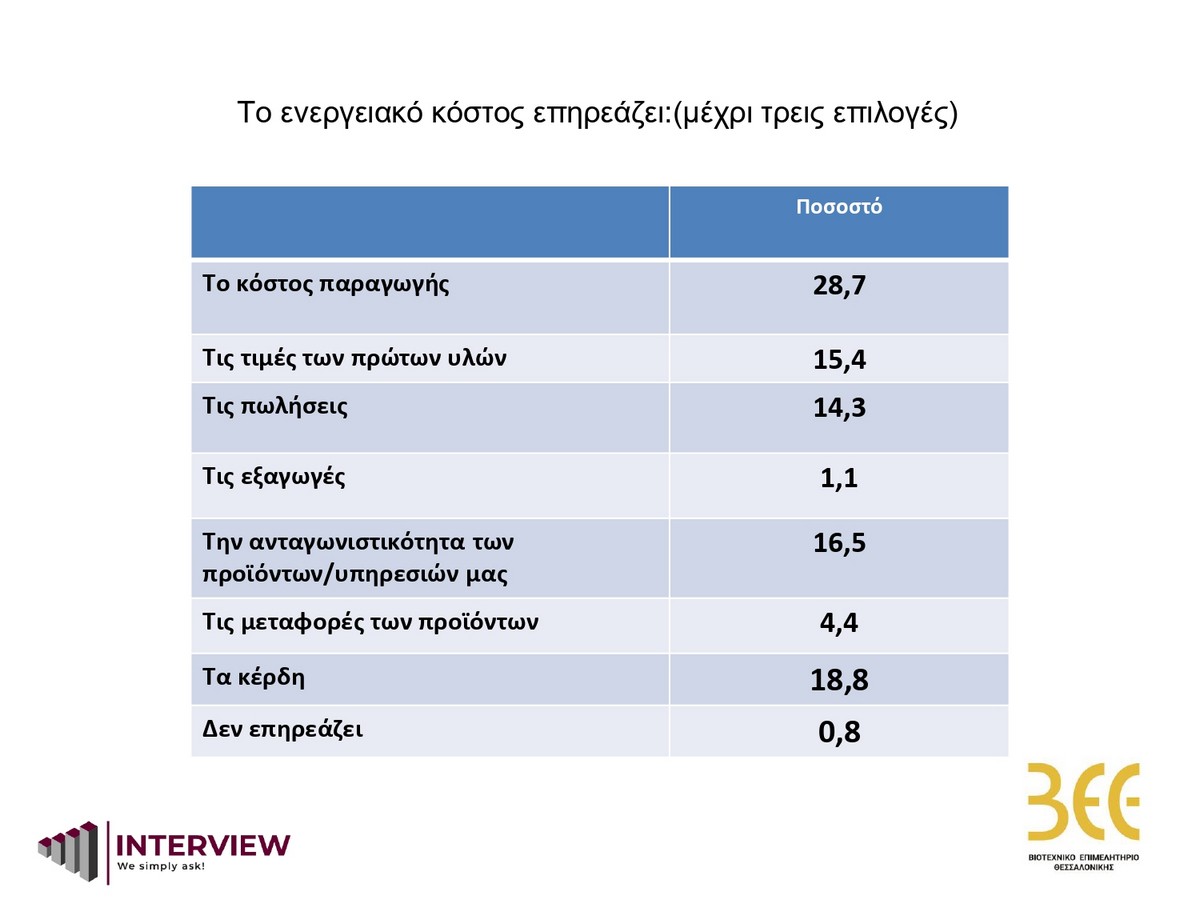 Για το 28,7% των συμμετεχόντων στην έρευνα το ενεργειακό κόστος έχει άμεσες επιπτώσεις στο κόστος παραγωγής, για το 18,8% στα κέρδη, για το 16,5% στην ανταγωνιστικότητα, για το 15,4% στις τιμές των πρώτων υλών, για το 14,3% στις πωλήσεις, για το 4,4% στις μεταφορές των προϊόντων/υπηρεσιών, για το 1,1% στις εξαγωγές, ενώ το 0,8% λέει πως «δεν επηρεάζει».