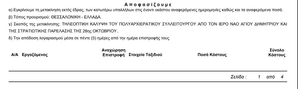 Η απόφαση που αναρτήθηκε στη Διαύγεια προβλέπει συγκεκριμένα τη μετακίνηση συνολικά 22 υπαλλήλων με κόστος συνολικά 26.276 ευρώ.