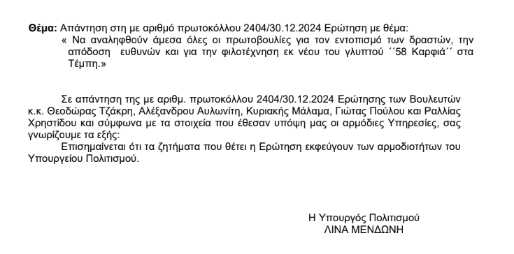 Η απάντηση της κ. Μενδώνη; “Επισημαίνεται ότι τα ζητήματα που θέτει η ερώτηση εκφεύγουν των αρμοδιοτήτων του Υπουργείου Πολιτισμού”. Κι όμως.
