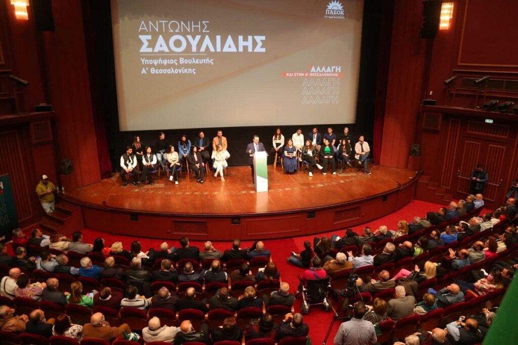 «Γέμισε» το Ολύμπιον το πρωί του Σαββάτου ο κόσμος που υποστηρίζει τον Αντώνη Σαουλίδη, υποψήφιο βουλευτή Α’ Θεσσαλονίκης με το ΠΑΣΟΚ-Κίνημα Αλλαγής.