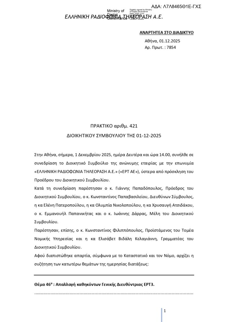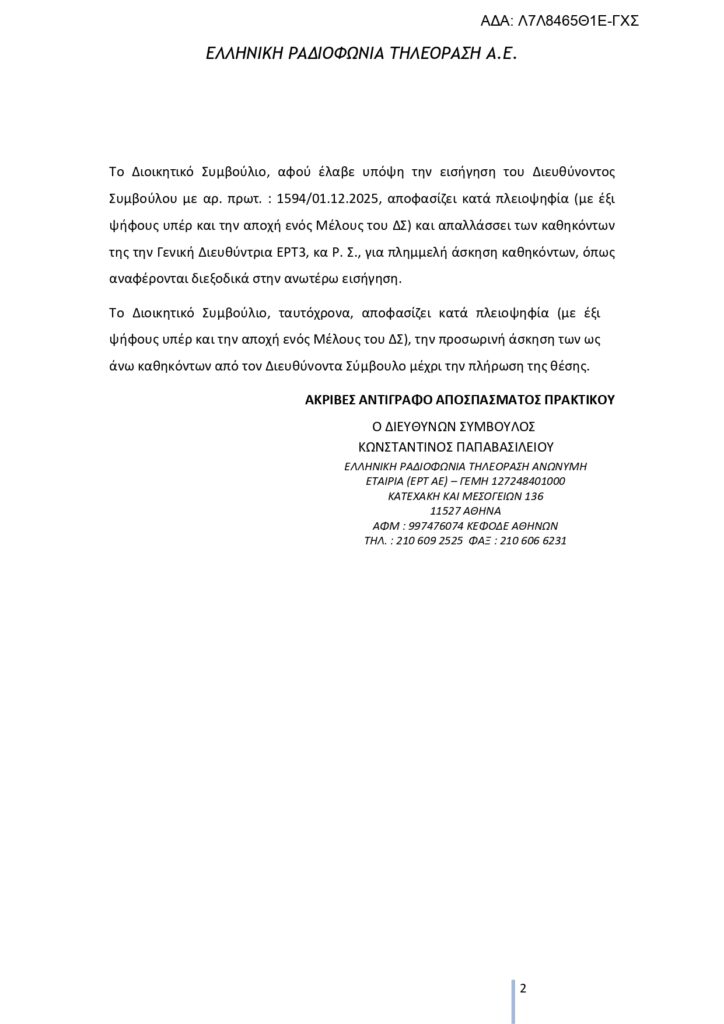 Με απόφαση του ΔΣ της ΕΡΤ την προσωρινή άσκηση των καθηκόντων του γενικού διευθυντή της ΕΡΤ3 θα ασκεί μέχρι την πλήρωση της θέσης ο διευθυνων σύμβουλος Κωνσταντίνος Παπαβασιλείου.