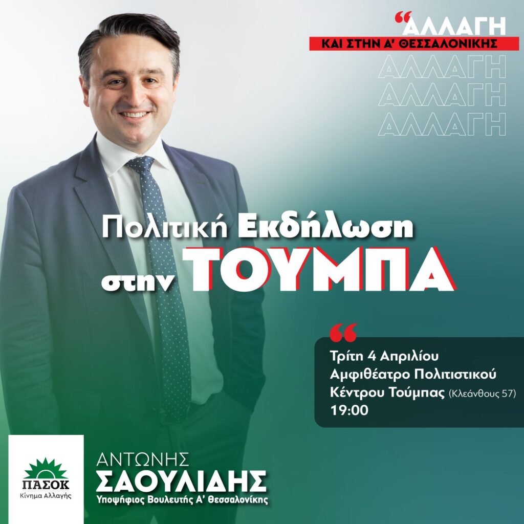 Πολιτική εκδήλωση στην Δ’ Δημοτική Κοινότητα οργανώνει ο υποψήφιος βουλευτής Α’ Θεσσαλονίκης με το ΠΑΣΟΚ- Κίνημα Αλλαγής Αντώνης Σαουλίδης.