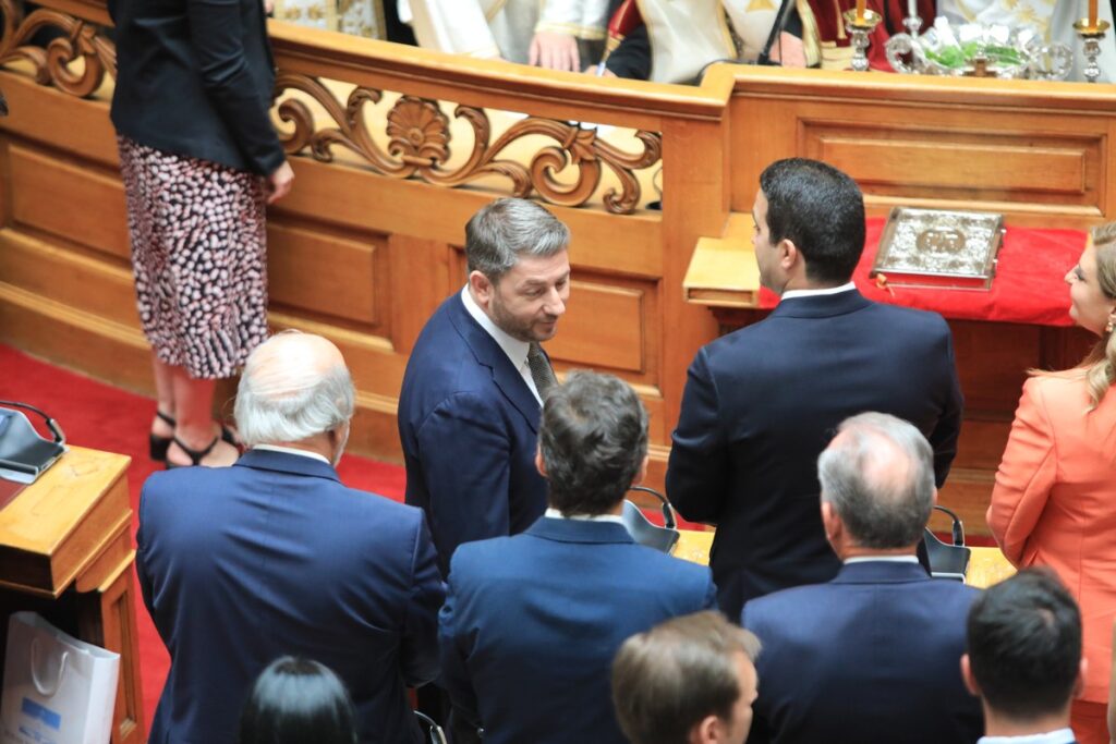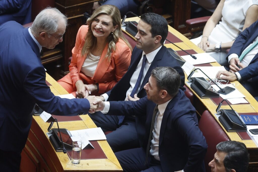 Μέσα στην αίθουσα της Ολομέλειας ο κ. Ανδρουλάκης προτίμησε να μπει από την πόρτα όπου βρίσκονται τα έδρανα της ΝΔ με αποτέλεσμα να έχει μια τυπική χειραψία με τον Κυριάκο Μητσοτάκη.