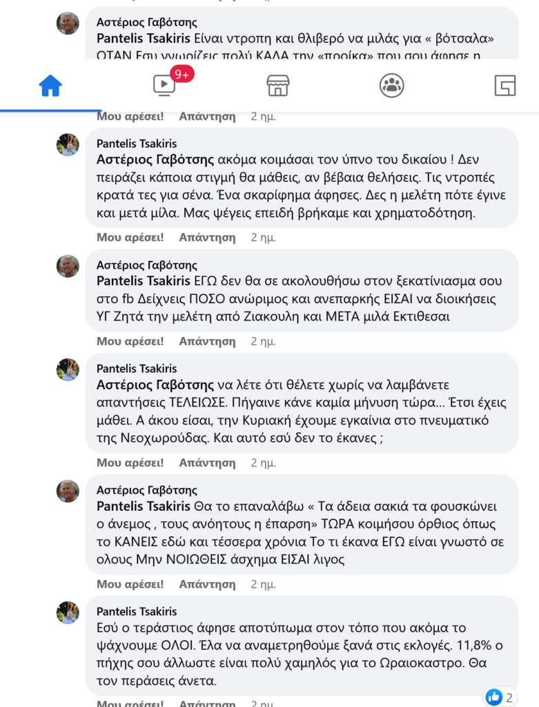Κάποια στιγμή, στα σχόλια, παρενέβη ο Αστέριος Γαβότσης, πρώην δήμαρχος και επικεφαλής της παράταξης της μείζονος αντιπολίτευσης στον Δήμο για να υπερθεματίσει για τα όσα δεν γίνονται επί δημαρχίας Τσακίρη.