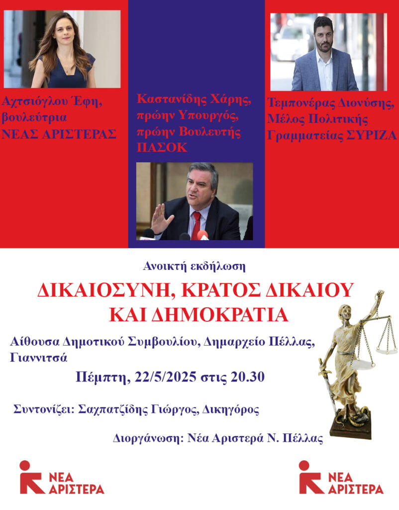 Η Νομαρχιακή Επιτροπή Νέας Αριστεράς Νομού Πέλλας διοργανώνει ανοικτή εκδήλωση με θέμα: «Δικαιοσύνη, Κράτος Δικαίου και Δημοκρατία».