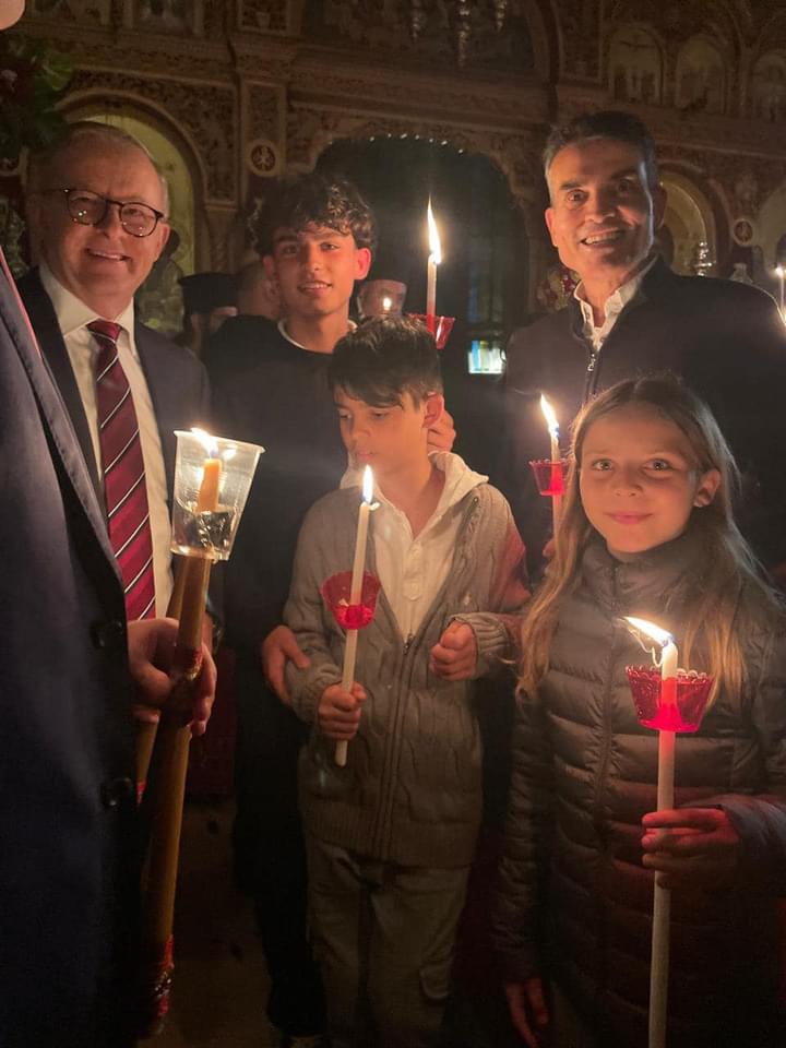Μαζί με ομογενείς είπε το “Χριστός Ανέστη” στον Ιερό Ναό της περιοχής Kogarah στο Σίδνεϋ, όπου χοροστάτησε ο Αρχιεπίσκοπος Αυστραλίας Μακάριος, ο Βουλευτής Α’ Θεσσαλονίκης της ΝΔ, Δημήτρης Κούβελας.