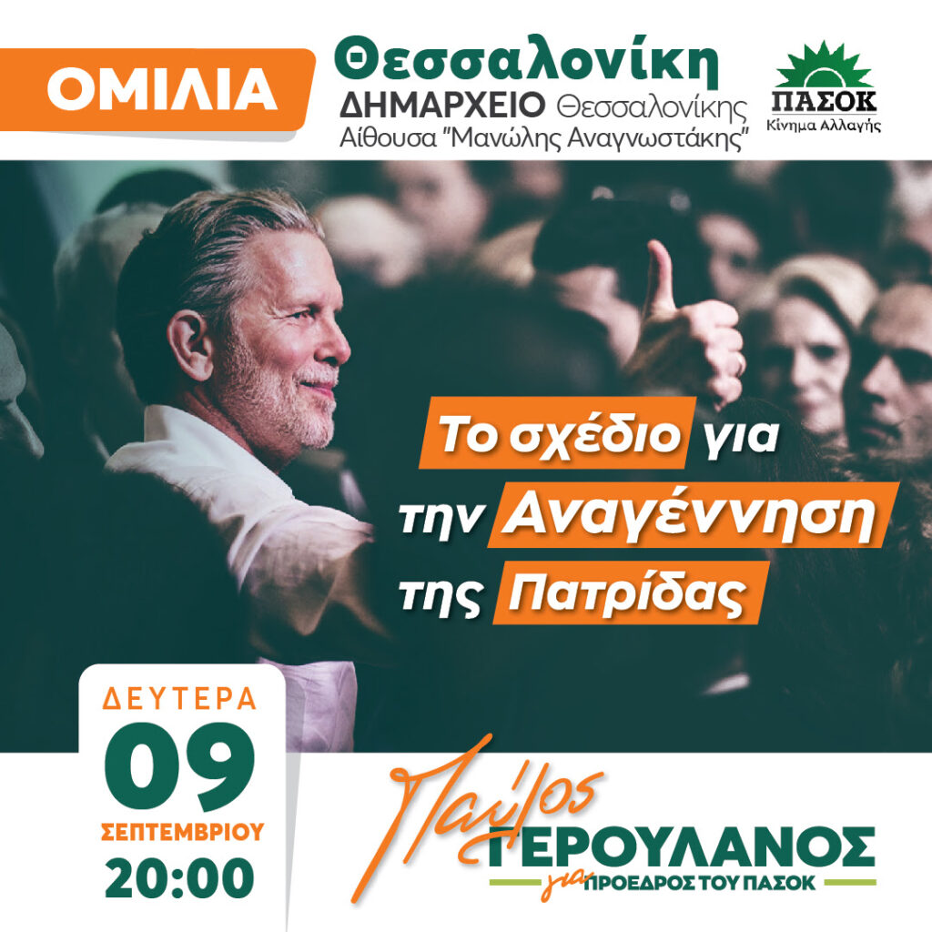 Μετά την επικείμενη παρουσίαση της πρότασής του για την αναγέννηση του ΠΑΣΟΚ στις 3 Σεπτεμβρίου σε διαδικτυακή εκδήλωση, ο Παύλος Γερουλάνος θα παρουσιάσει τη Δευτέρα 9 Σεπτεμβρίου σε ανοιχτή εκδήλωση στη Θεσσαλονίκη (Δημαρχείο Θεσσαλονίκης, αίθουσα Μανώλης Αναγνωστάκης, στις 8 μ.μ.) το σχέδιό του για την Αναγέννηση της Ελλάδας, μέσα από ριζικές μεταρρυθμίσεις στο διοικητικό και παραγωγικό μοντέλο της χώρας.