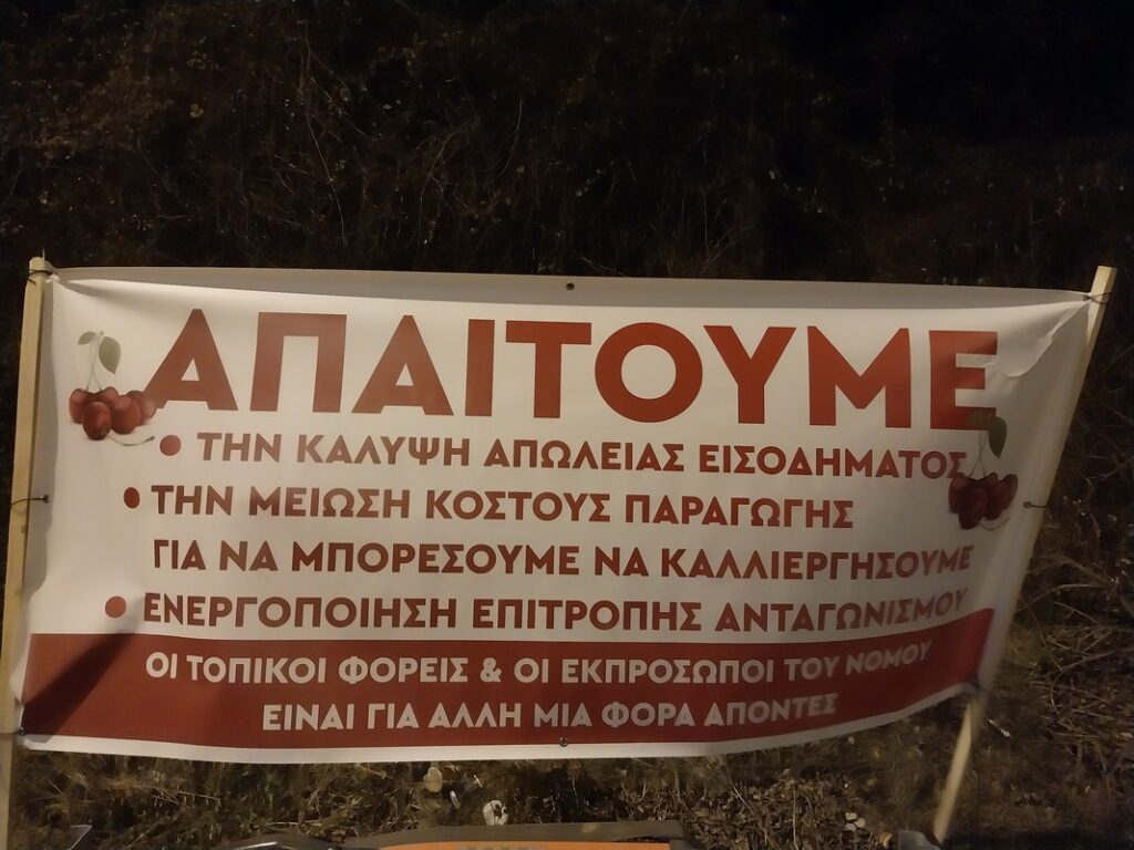 Μεταξύ των αιτημάτων των αγροτών είναι η αναπλήρωση του χαμένου εισοδήματος για όλους τους κερασοπαραγωγούς που η σοδειά τους καταστράφηκε κατά τη διάρκεια της συγκομιδής λόγω των παρατεταμένων και άκαιρων βροχοπτώσεων, μείωση του κόστους παραγωγής (αφορολόγητο πετρέλαιο, μείωση τιμής ρεύματος με πλαφόν 0,07 ευρώ την κιλοβατώρα κ.α.), κατώτατες εγγυημένες τιμές, αλλαγή κανονισμού του ΕΛΓΑ προκειμένου να ασφαλίζει και να αποζημιώνει την παραγωγή και το κεφάλαιο από όλες τις φυσικές καταστροφές και νόσους στο 100%, αλλά και απλούστευση της διαδικασίας μετάκλησης εργατών από τρίτες χώρες, ώστε να λυθεί το πρόβλημα της μη ανεύρεσης εργατών γης και ταυτόχρονα μείωσης του κόστους συγκομιδής.