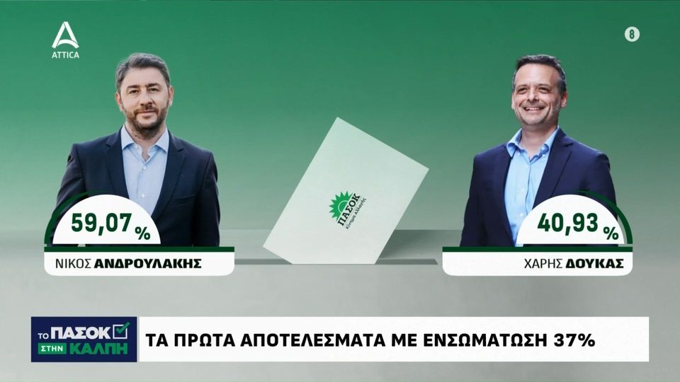 Από την αρχική ροή των αποτελεσμάτων διαφάνηκε το μεγάλο προβάδισμα Ανδρουλάκη έναντι του Χάρη Δούκα. Πρώτο πανελλαδικό αποτέλεσμα στο 37% ΄έδειχνε την επικράτηση του Νίκου Ανδρουλάκη.