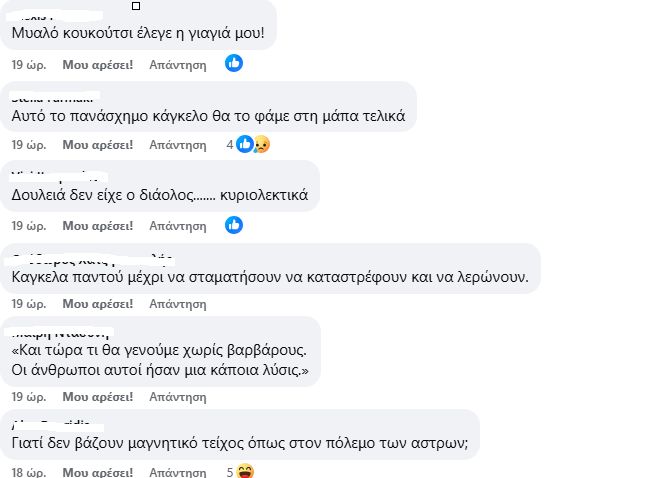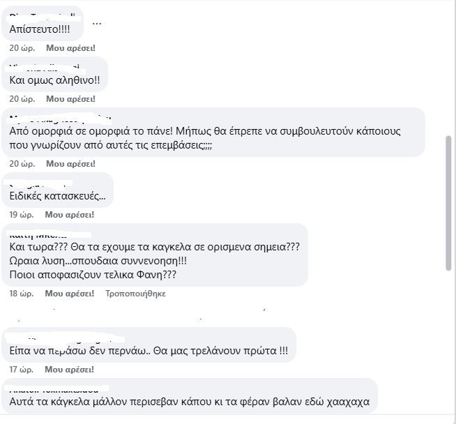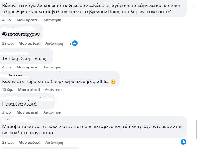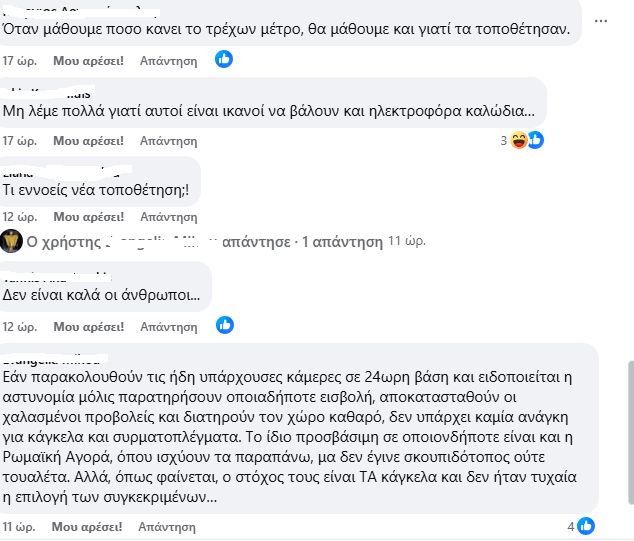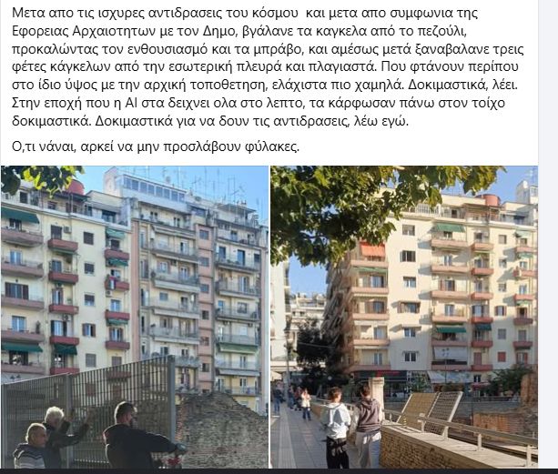 «Μετα απο τις ισχυρες αντιδρασεις του κόσμου και μετα απο συμφωνια της Εφορειας Αρχαιοτητων με τον Δημο, βγάλανε τα καγκελα από το πεζούλι, προκαλώντας τον ενθουσιασμό και τα μπράβο, και αμέσως μετά ξαναβαλανε τρεις φέτες κάγκελων από την εσωτερική πλευρά και πλαγιαστά. Που φτάνουν περίπου στο ίδιο ύψος με την αρχική τοποθετηση, ελάχιστα πιο χαμηλά. Δοκιμαστικά, λέει. Στην εποχή που η ΑΙ στα δειχνει ολα στο λεπτο, τα κάρφωσαν πάνω στον τοίχο δοκιμαστικά. Δοκιμαστικά για να δουν τις αντιδρασεις, λέω εγώ. Ο,τι νάναι, αρκεί να μην προσλάβουν φύλακες», αναφέρει χαρακτηριστικά χρήστης του Facebook.