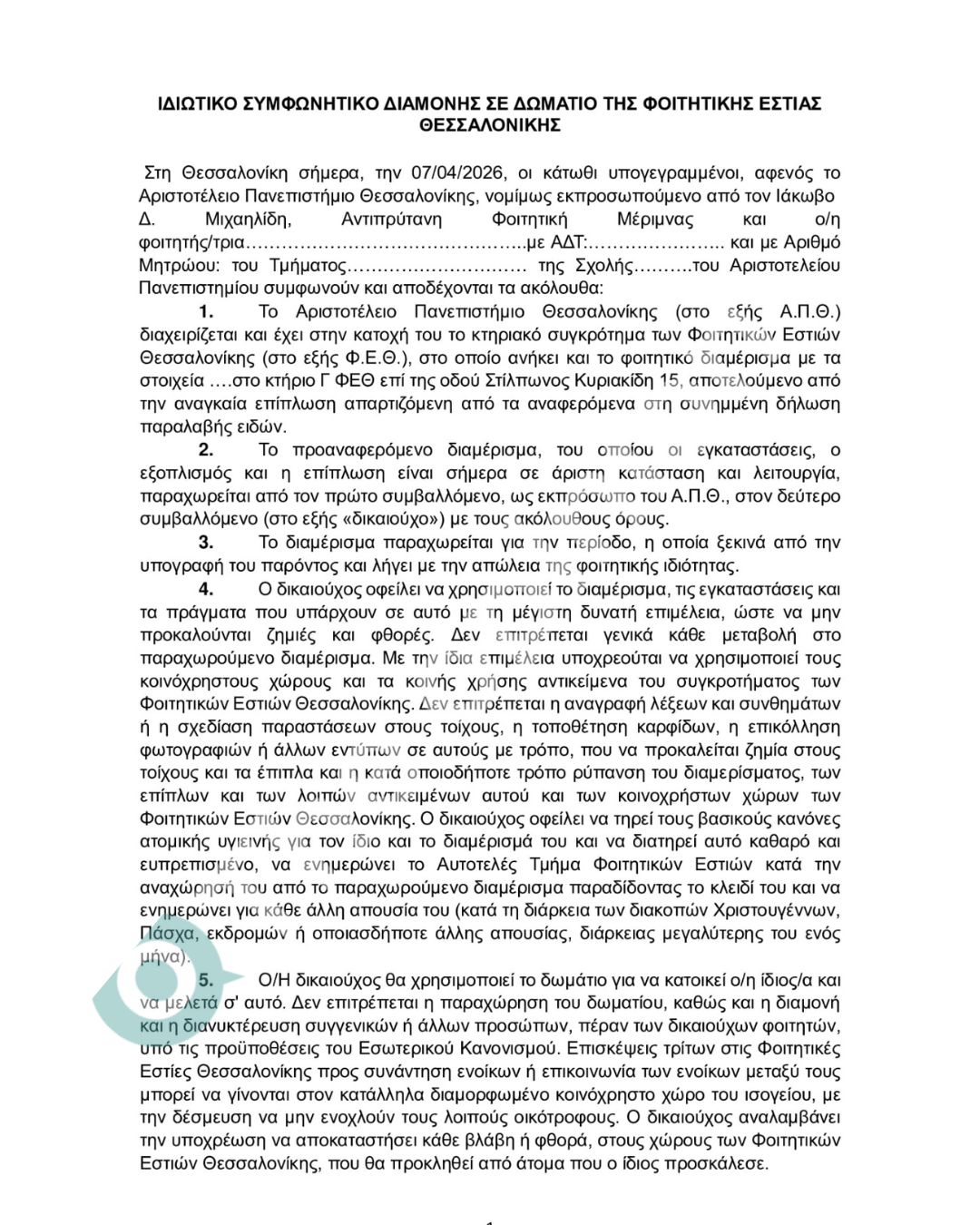 «Έλεγχος δωματίων σε οποιαδήποτε στιγμή, απαγόρευση συναθροίσεων» – Με ιδιωτικά συμφωνητικά οι φοιτητές στις Εστίες του ΑΠΘ (ΦΩΤΟ)