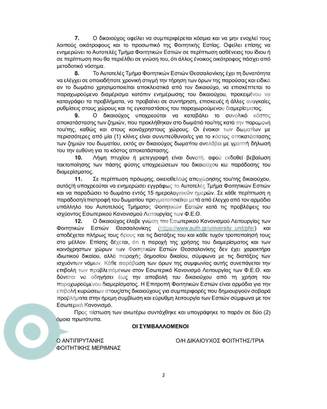 Το ιδιωτικό συμφωνητικό – που έχει στη διάθεση του το ΤheOpinion- και το οποίο στάλθηκε στους φοιτητές των εστιών στις 6 Απριλίου καθορίζει τους κανόνες για τη διαμονή τους στα δωμάτια.