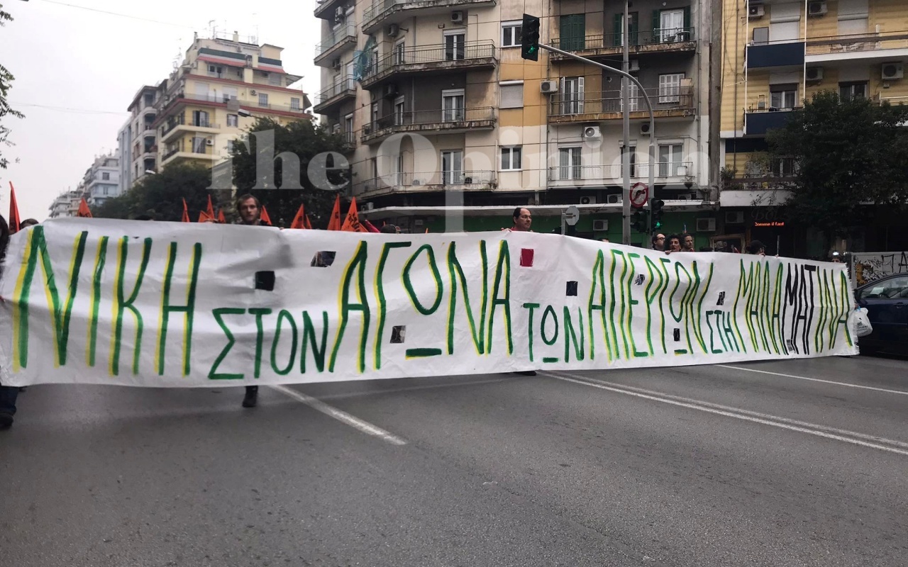 Αξίζει να σημειωθεί πως στην κεφαλή της πορείας βρίσκεται πανό που αναγράφει «Νίκη στον αγώνα στη Μαλαματίνα».