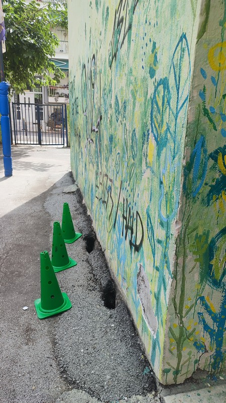 Ρωγμές σε τοίχους, υποχώρηση και καθίζηση του εδάφους, καθώς και τρύπες που αποκαλύπτουν τα θεμέλια του προαύλειου χώρου του σχολείου, καθιστούν ιδιαίτερα επικίνδυνο το εν λόγω σχολικό περιβάλλον.