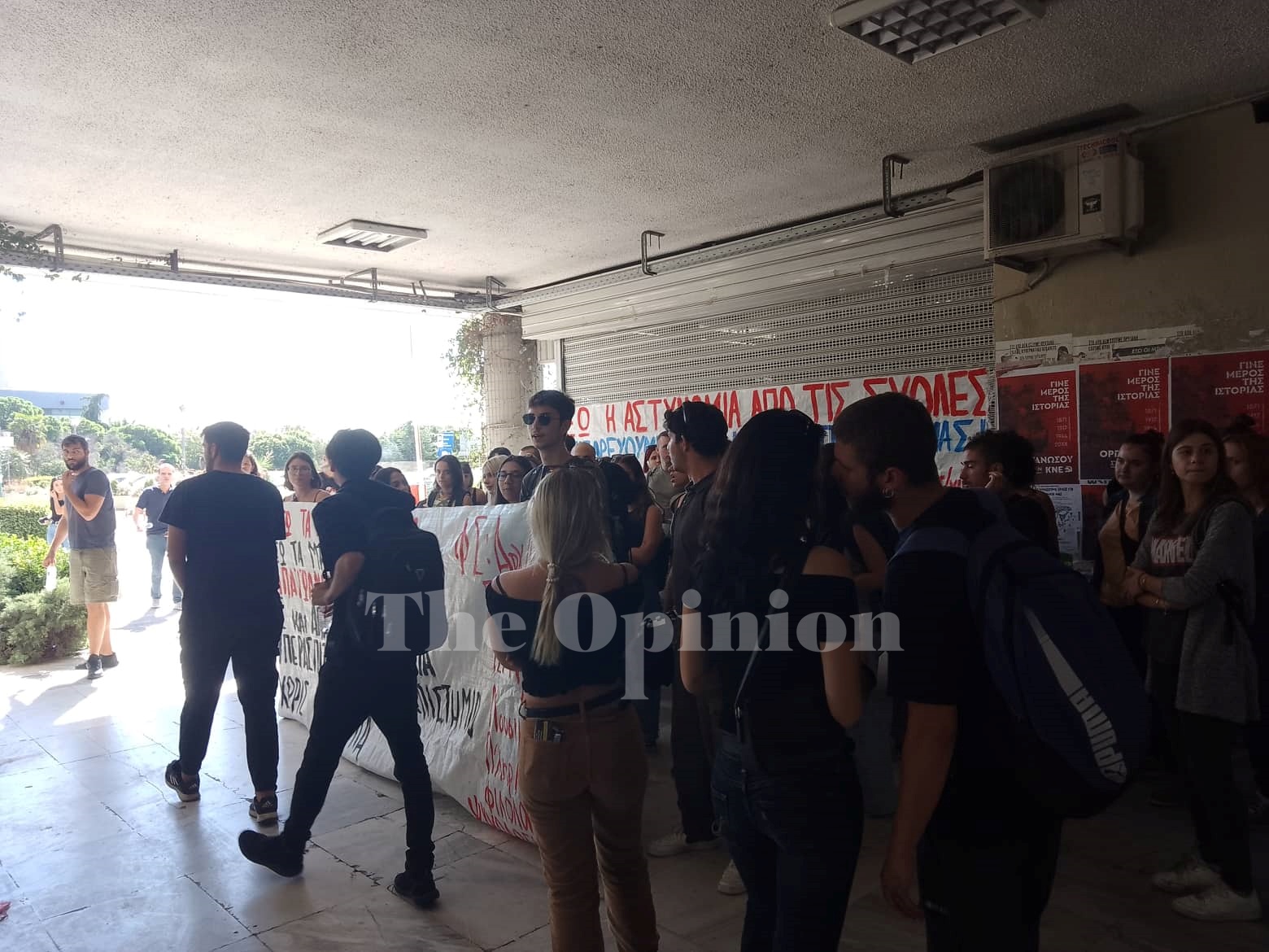 Οι φοιτητές κρατούν πανό και φωνάζουν συνθήματα κατά του Πρύτανη του Πανεπιστημίου, Νίκου Παπαϊωάννου.