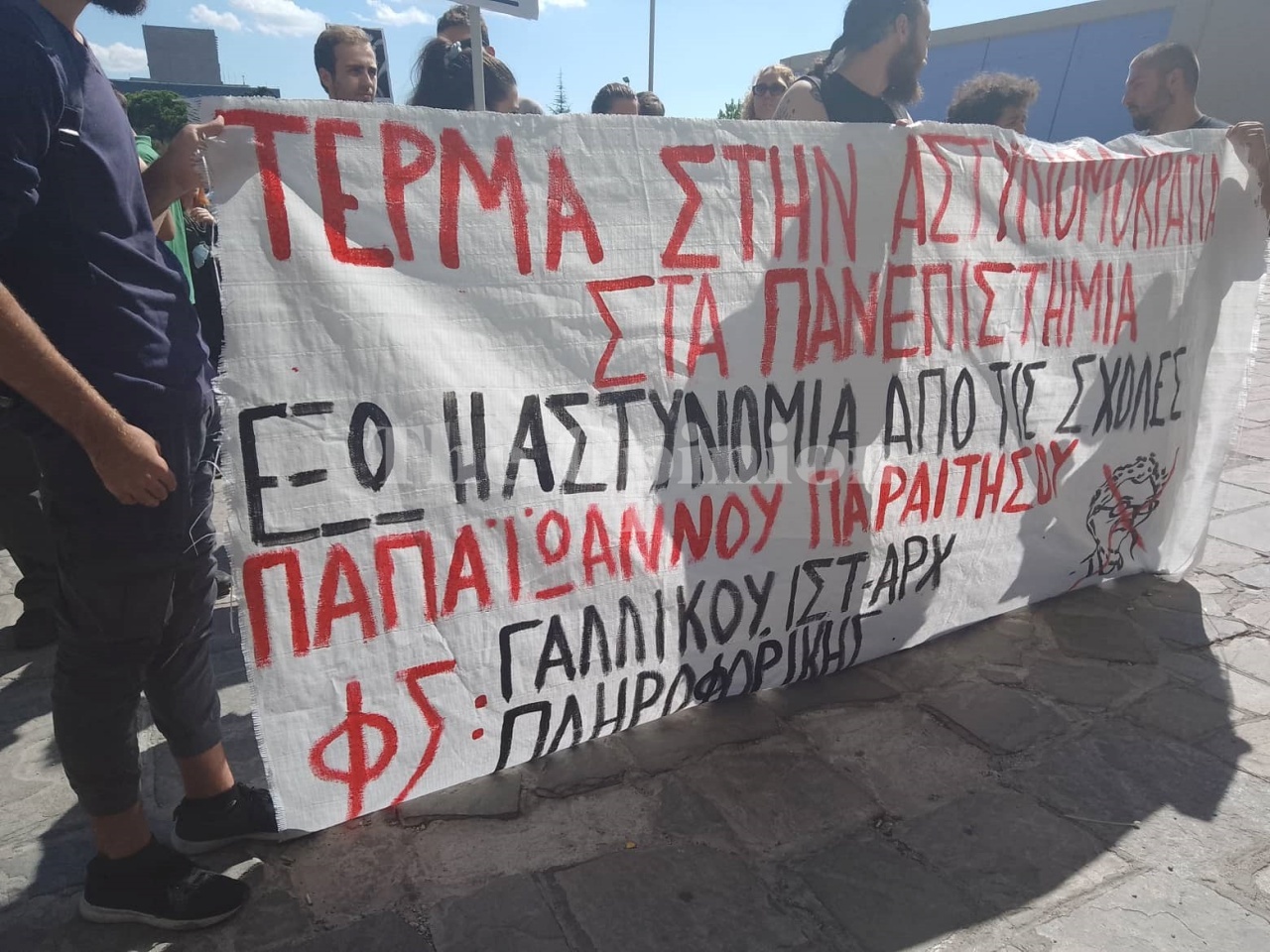 «Τέρμα στην αστυνομοκρατία στα πανεπιστήμια» αναφέρει το κεντρικό πανό των διαμαρτυρόμενων.