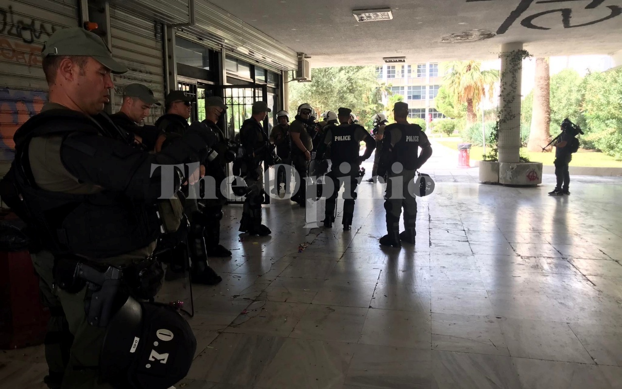 Πάνοπλες αστυνομικές δυνάμεις έχουν κατακλείσει το κτίριο διοίκησης, ενώ λίγα μέτρα πιο μακριά υπάρχουν συγκεντρωμένοι φοιτητές.