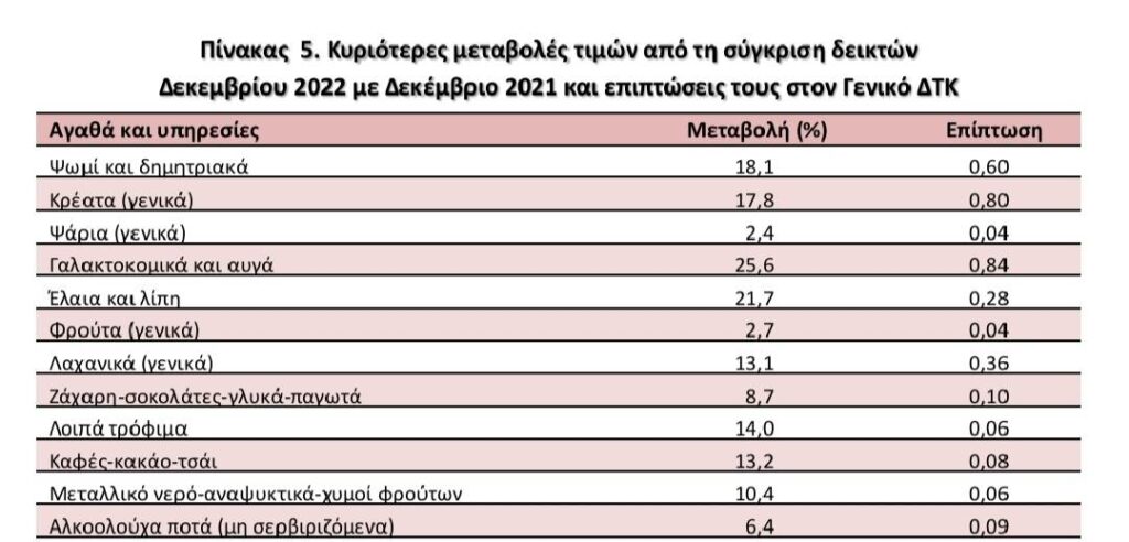 Ειδικότερα, για τον Δεκέμβριο μέσα σε διάστημα ενός μήνα, από τον Νοέμβριο, καταγράφονται αυξήσεις της τάξης του 0,4% στην ομάδα “διατροφή και μη αλκοολούχα ποτά”, η οποία αιτιολογείται από την αύξηση κυρίως των τιμών σε: ψωμί, μοσχάρι, χοιρινό, νωπά ψάρια, τυριά, ελαιόλαδο και λαχανικά κατεψυγμένα ή διατηρημένα. Παράλληλα, μέρος της αύξησης αυτής αντισταθμίστηκε από τη μείωση κυρίως των τιμών σε: νωπά φρούτα και νωπά λαχανικά (-6,1% και -2,1% αντίστοιχα).