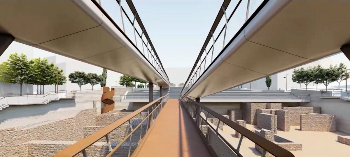 2. Στο κεντρικό τμήμα διαμορφώνεται το θέατρο με τα διαδοχικά πλατό-βαθμίδες και την πεζογέφυρα-πασαρέλα. Στα πλευρικά πεζοδρόμια διαμορφώνονται στάσεις που λειτουργούν ως ‘θεωρεία’ θέασης των ευρημάτων και της δημόσιας ζωής.