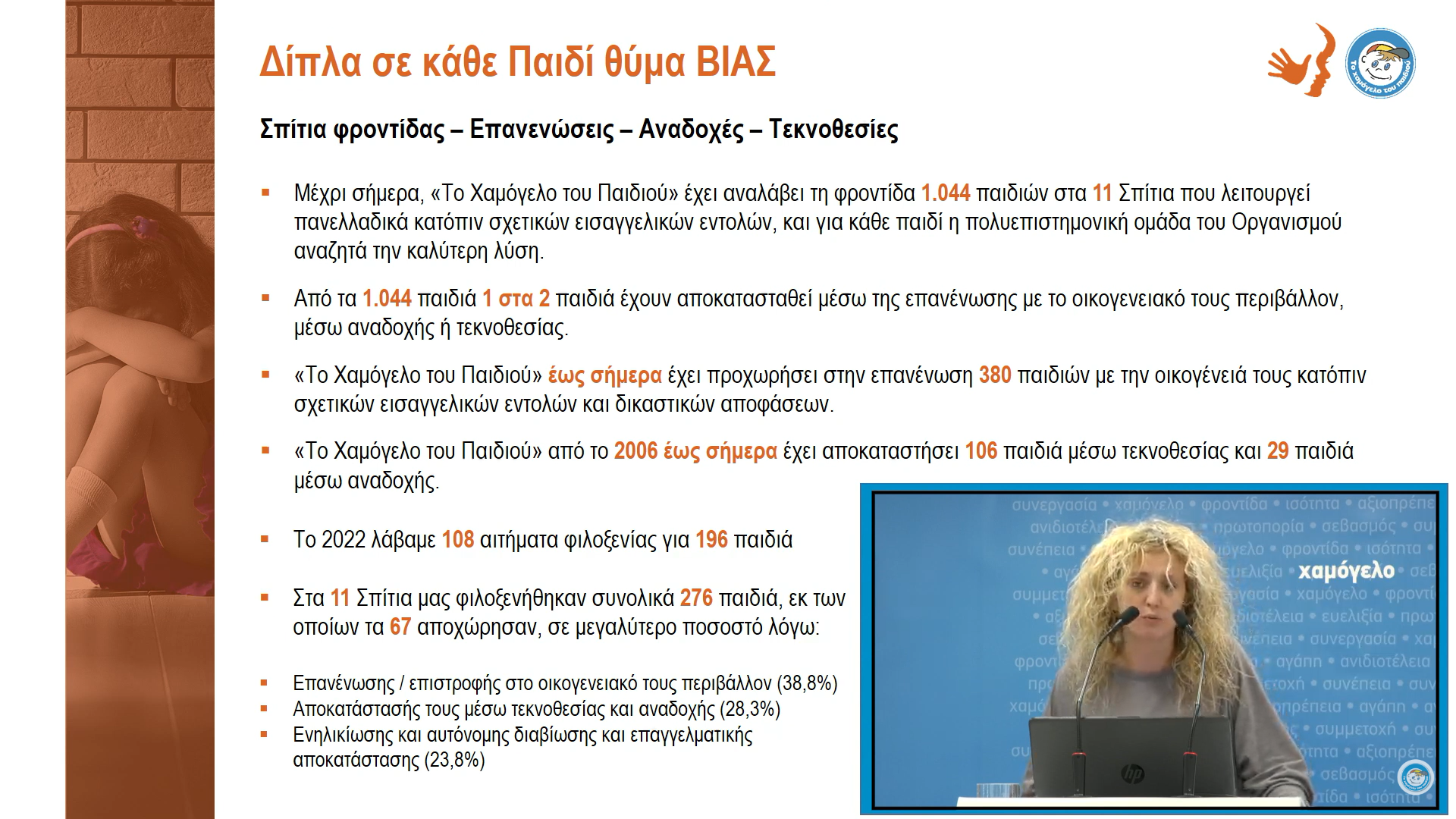 Για τα σπίτια φροντίδας του «Χαμόγελου του Παιδιού» και το απολογιστικό έργο για το περασμένο έτος, μίλησε η υπεύθυνη συντονίστρια Ιωάννα Λαμουμιντζή, όπου όλα αυτά τα χρόνια έχουν φροντιστεί 1.044 παιδιά, με τα μισά από αυτά να έχουν αποκατασταθεί μέσω της επανένωσης με το οικογενειακό τους περιβάλλον.