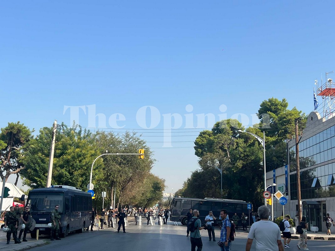 Κλούβες των ΜΑΤ, «έκοψαν» τον δρόμο στην πορεία των υγειονομικών, κλείνοντας τη Λεωφόρο Στρατού προς το κέντρο της πόλης, τη Ναπολέοντος Ζερβά και την Καυτατζόγλου.