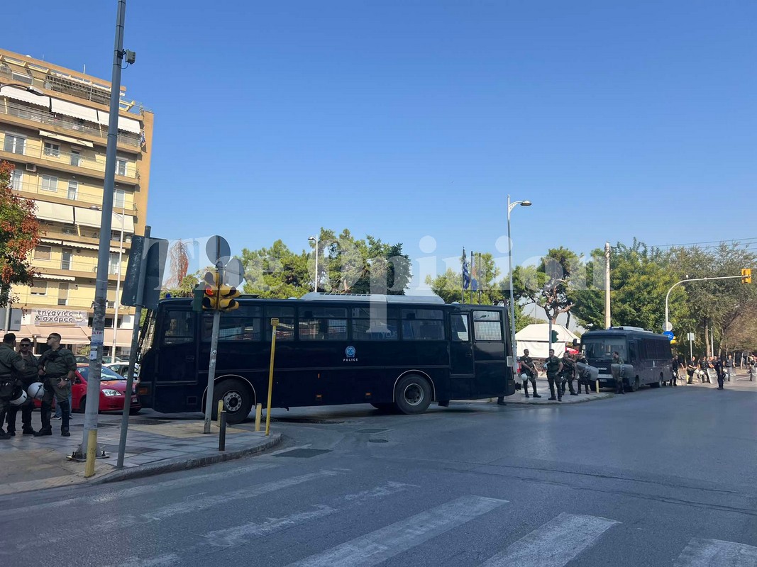Κλούβες των ΜΑΤ, «έκοψαν» τον δρόμο στην πορεία των υγειονομικών, κλείνοντας τη Λεωφόρο Στρατού προς το κέντρο της πόλης, τη Ναπολέοντος Ζερβά και την Καυτατζόγλου.