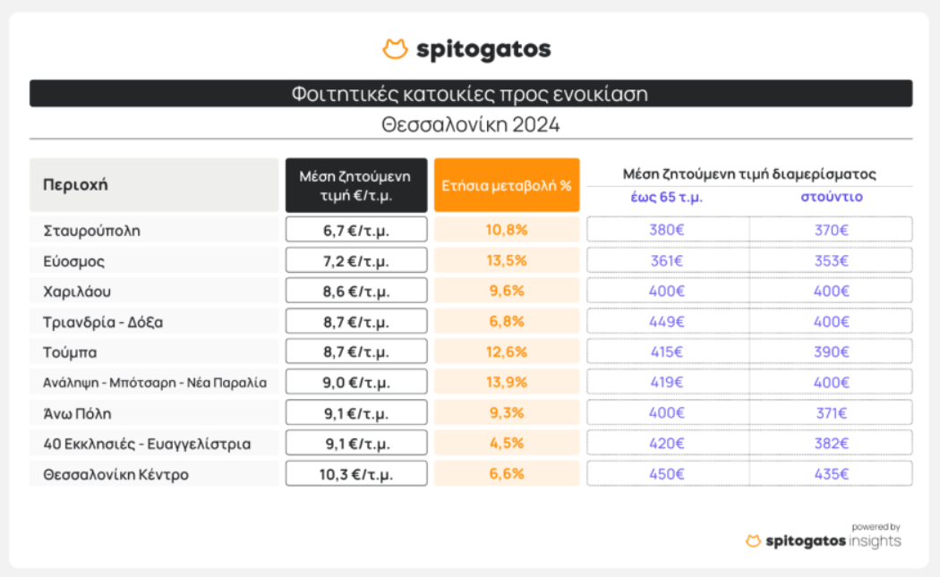 Οι μεγαλύτερες αυξήσεις μέσης ζητούμενης τιμής ανά τετραγωνικό μέτρο φοιτητικού σπιτιού σημειώθηκαν στην περιοχή Ανάληψη-Μπότσαρη-Νέα Παραλία, καθώς και στην περιοχή του Ευόσμου, όπου καταγράφεται μία από τις χαμηλότερες μέσες ζητούμενες τιμές για ενοικίαση στούντιο (353 ευρώ), σύμφωνα με τον δείκτη τιμών του Spitogatos.