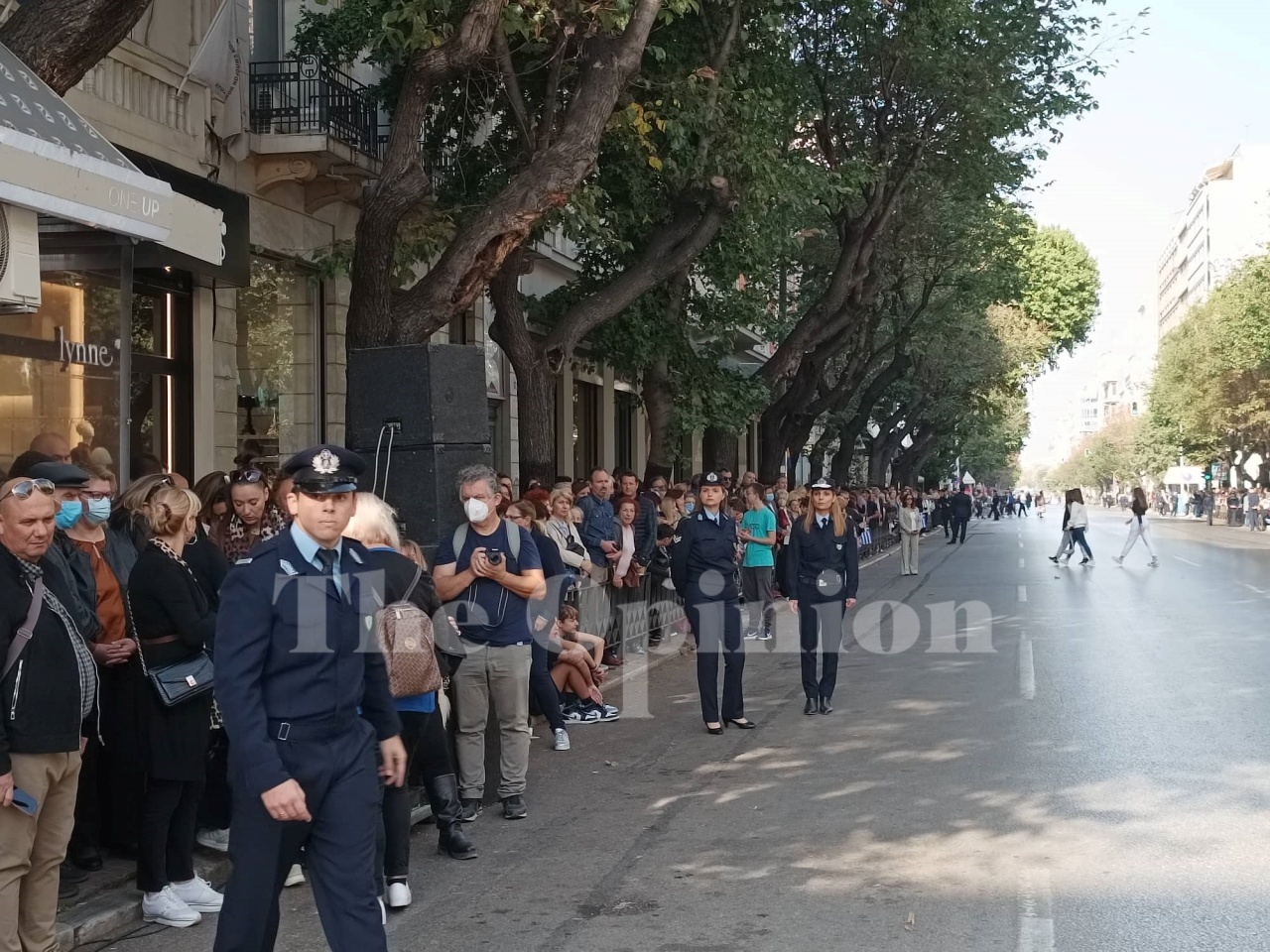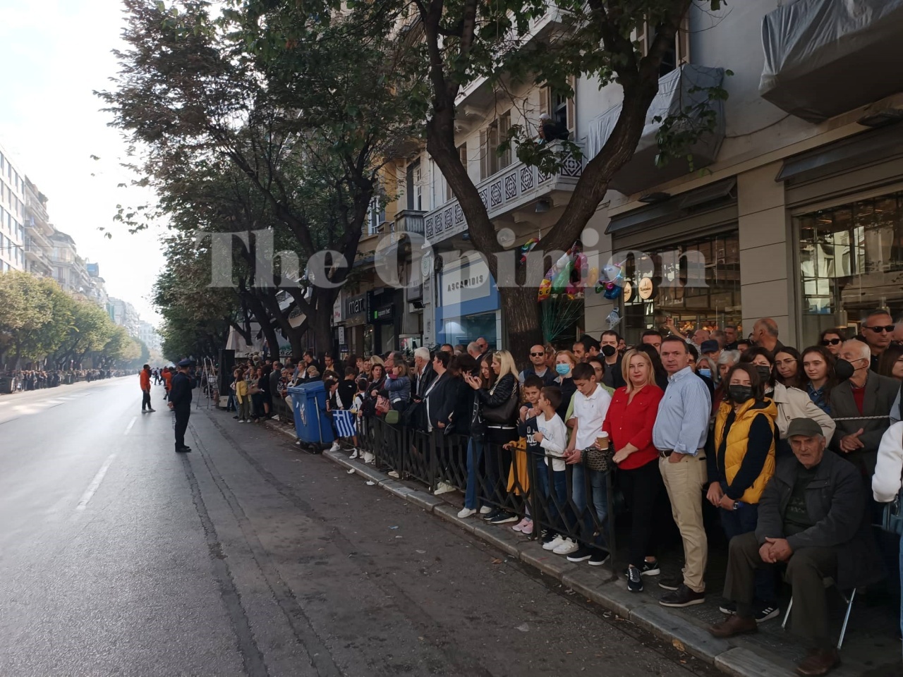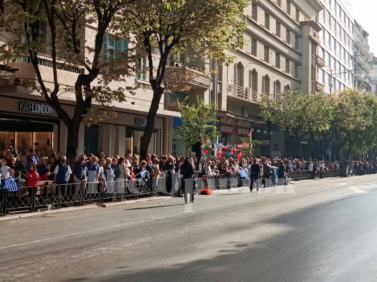 Σε όλο το μήκος της οδού Τσιμισκή παρευρίσκονται δεκάδες Θεσσαλονικείς που θέλουν να καμαρώσουν την ελληνική νεολαία που θα παρελάσει.
