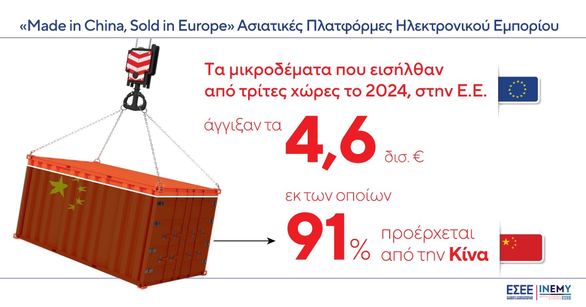Αξίζει να σημειωθεί ότι, μόνο το 2024 σχεδόν 4,6 δισεκατομμύρια μικρά δέματα αξίας κάτω των 150 ευρώ εισήλθαν στην Ευρωπαϊκή Ένωση. Ο όγκος αυτός μεταφράζεται σε περίπου 12 εκατομμύρια δέματα την ημέρα, ενώ εκτιμάται ότι το 91% προέρχεται από την Κίνα, σύμφωνα με τη Φανή Μπλιούμη, πρόεδρο της Ομοσπονδίας Εμπορίου, Επιχειρηματικότητας και Παραγωγικότητας Κεντρικής Ανατολικής Μακεδονίας και Θράκης.