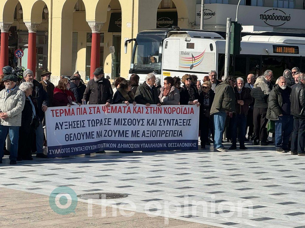 Συγκέντρωση διαμαρτυρίας πραγματοποίησαν το πρωί της Πέμπτης στη Θεσσαλονίκη συνταξιούχοι στο Άγαλμα Βενιζέλου. Οι συνταξιούχοι μεταξύ άλλων διεκδικούν την καταβολή της 13ης και 14ης σύνταξης, την επιστροφή αναδρομικών, την κατάργηση εισφορών και την ενίσχυση του e-ΕΦΚΑ με προσωπικό, καθώς και προσλήψεις στον τομέα της Υγείας. Να σημειωθεί ότι, θα ακολουθήσει νέα πανελλαδική συγκέντρωση στις 20 Μαρτίου στην πλατεία Συντάγματος στις 12 το μεσημέρι, με πορεία προς το Μέγαρο Μαξίμου.
