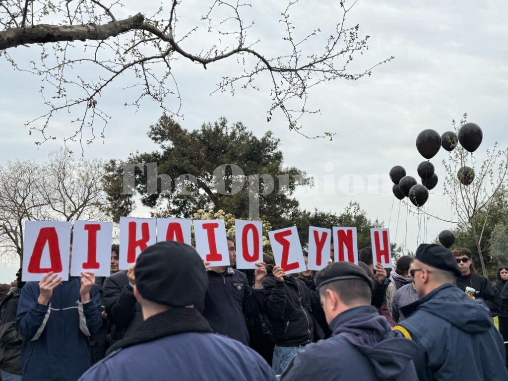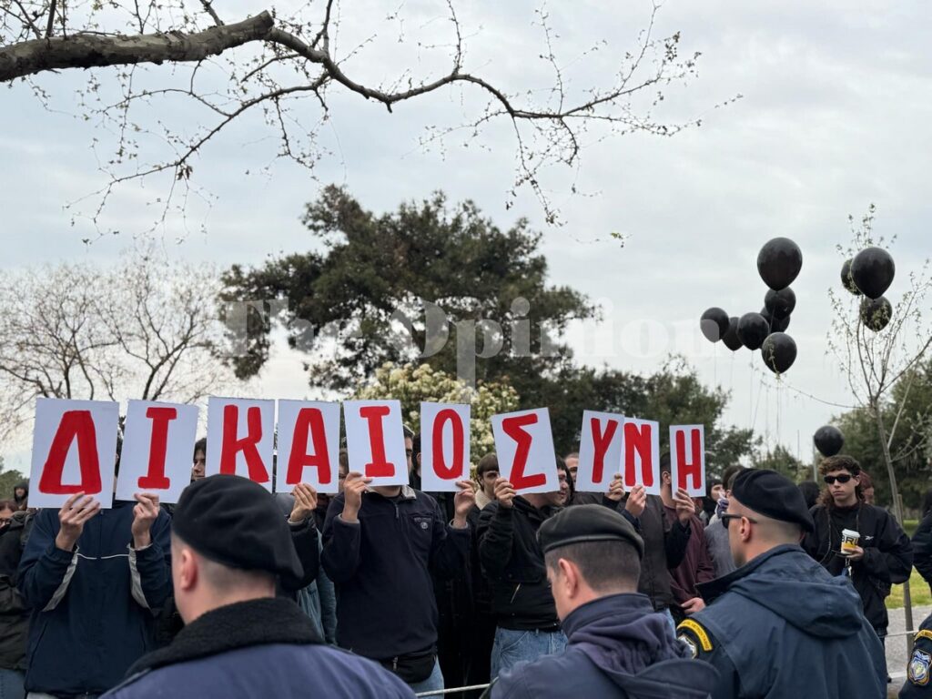 Στην Θεσσαλονίκη μια ομάδα νέων παιδιών με μαύρα μπαλόνια σήκωσε τα γράμματα που σχημάτιζαν τη λέξη “ΔΙΚΑΙΟΣΥΝΗ”.