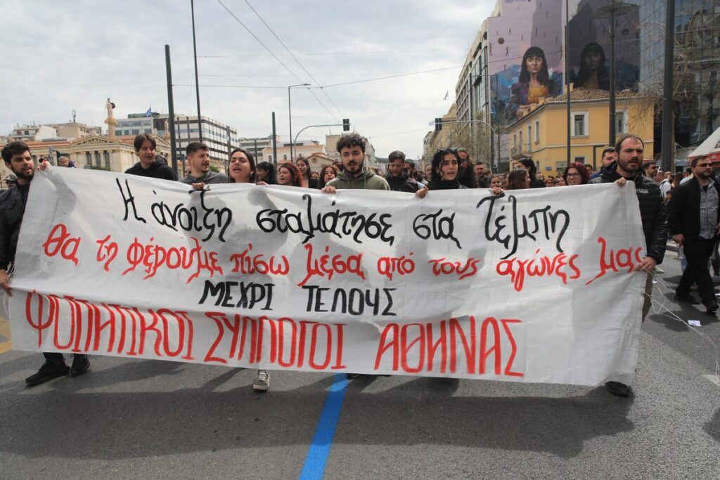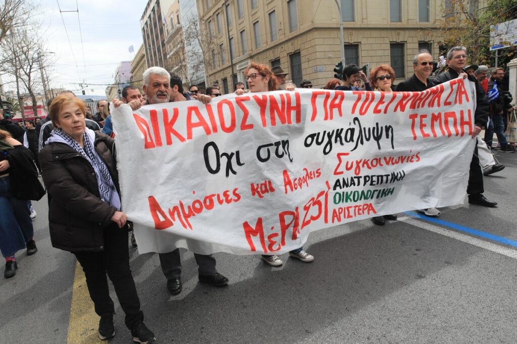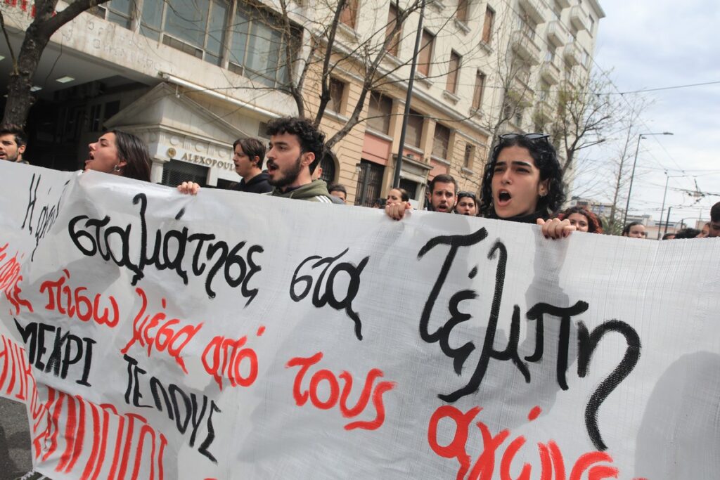Στην Αθήνα φοιτητικοί σύλλογοι και το ΜΕΡΑ25 μετά το πέρας της στρατιωτικής παρέλασης πραγματοποίησαν πορεία. Τα σχετικά πανό έγραφαν “Η άνοιξη σταμάτησε στα Τέμπη. Θα τη φέρουμε πίσω μέσα από τους αγώνες μας. Μέχρι τέλους” και “Δικαιοσύνη για το έγκλημα στα Τέμπη. Όχι στη συγκάλυψη. Δημόσιες και ασφαλείς συγκοινωνίες”
