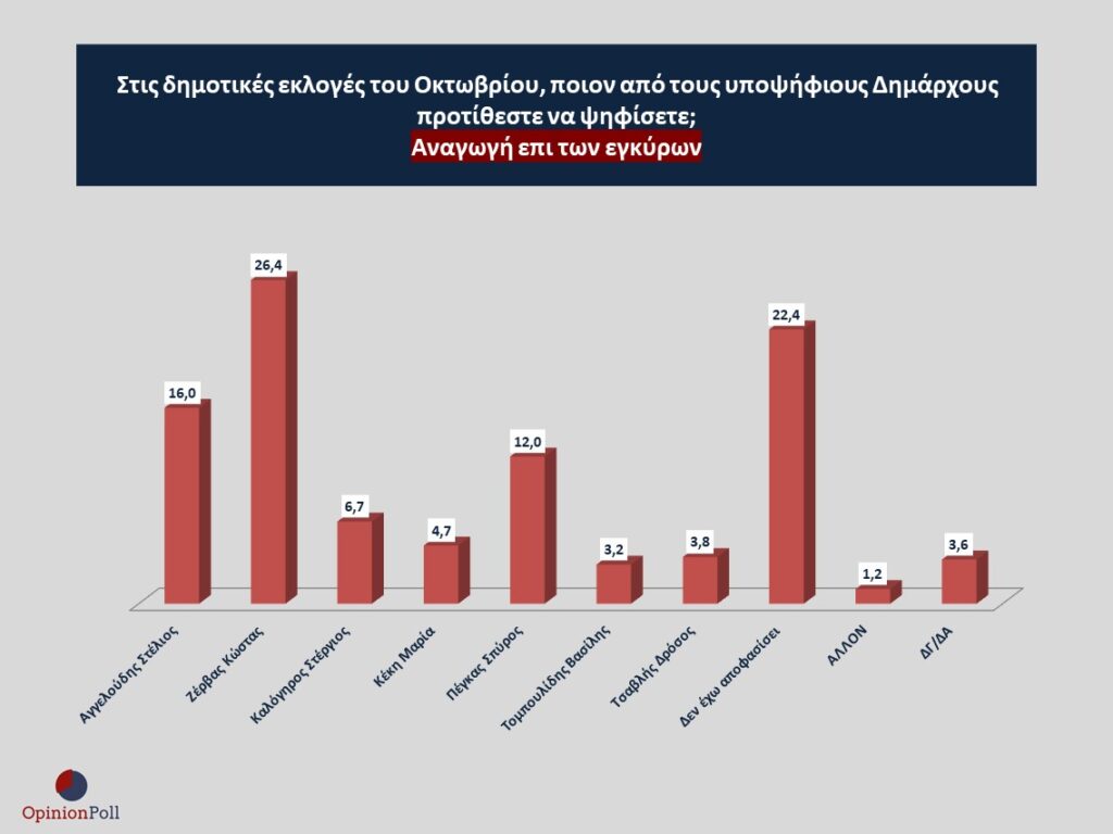 Στον πρώτο γύρο και στην πρόθεση ψήφου επί των εγκύρων ο Κωνσταντίνος Ζέρβας προηγείται με 26.4% έναντι 16% του Στέλιου Αγγελούδη. Ακολουθούν οι Σπύρος Πέγκας με 12%, ο Στέργιος Καλόγηρος με 6.7% , η Μαρία Κέκη (Πόλη Ανάποδα) με 4.7% , ο Δρόσος Τσαβλής με 3.8% και ο Βασίλης Τομπουλίδης με 3.2%. Σημειώνεται, ότι το 22.4% εμφανίζεται να είναι αναποφάσιστοι και το 3.6% να μην απαντά.