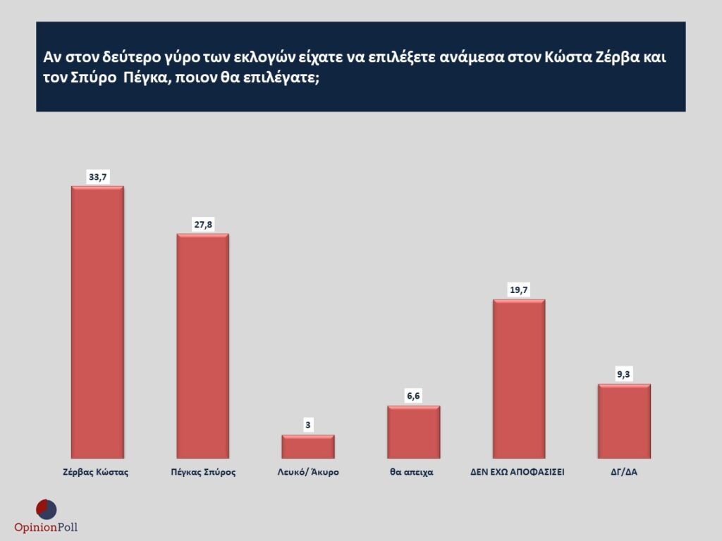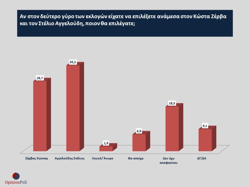 Το ιδιαίτερα σημαντικό στοιχείο που εμφανίζεται είναι ότι σε ένα δεύτερο γύρο με αντιπάλους τον Κ. Ζέρβα και τον Σ. Αγγελούδη , φαίνεται να κερδίζει την μάχη ο Σ. Αγγελούδης με 35.2% έναντι 28.7% με το 19.3% να είναι αναποφάσιστοι και το 9.1% να αποφεύγουν να απαντήσουν. Αντίθετα σε ένα ενδεχόμενο δίδυμο δευτέρου γύρου με τον Κ. Ζέρβα απέναντι στον Σπ. Πέγκα, ο Κ. Ζέρβας εμφανίζεται να επικρατεί με 33.7% έναντι 27.8%, με 19.7% αναποφάσιστους και 9.3% να μην απαντούν.