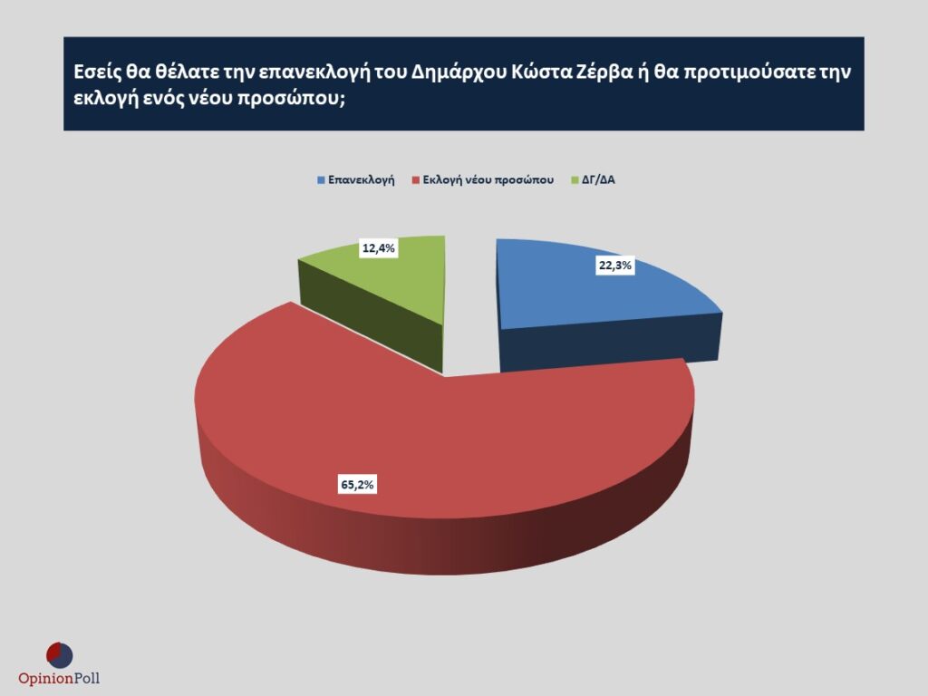– Το 22.3% απαντά ότι θα ήθελε την επανεκλογή του Δημάρχου Κώστα Ζέρβα , ενώ το 65.2% απαντά ότι θα ήθελε την εκλογή κάποιου νέου προσώπου, με το 12.4% να μην παίρνει θέση.