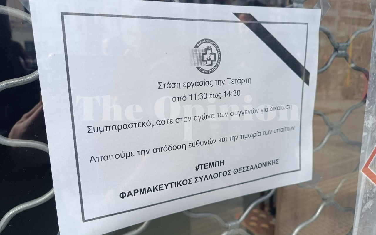 Το Διοικητικό Συμβούλιο του Φαρμακευτικού Συλλόγου Θεσσαλονίκης αποφάσισε ομόφωνα την κήρυξη στάσης εργασίας για σήμερα έως τις 14:30, με αφορμή τη συμπλήρωση ενός χρόνου από την ανείπωτη σιδηροδρομική τραγωδία στα Τέμπη.