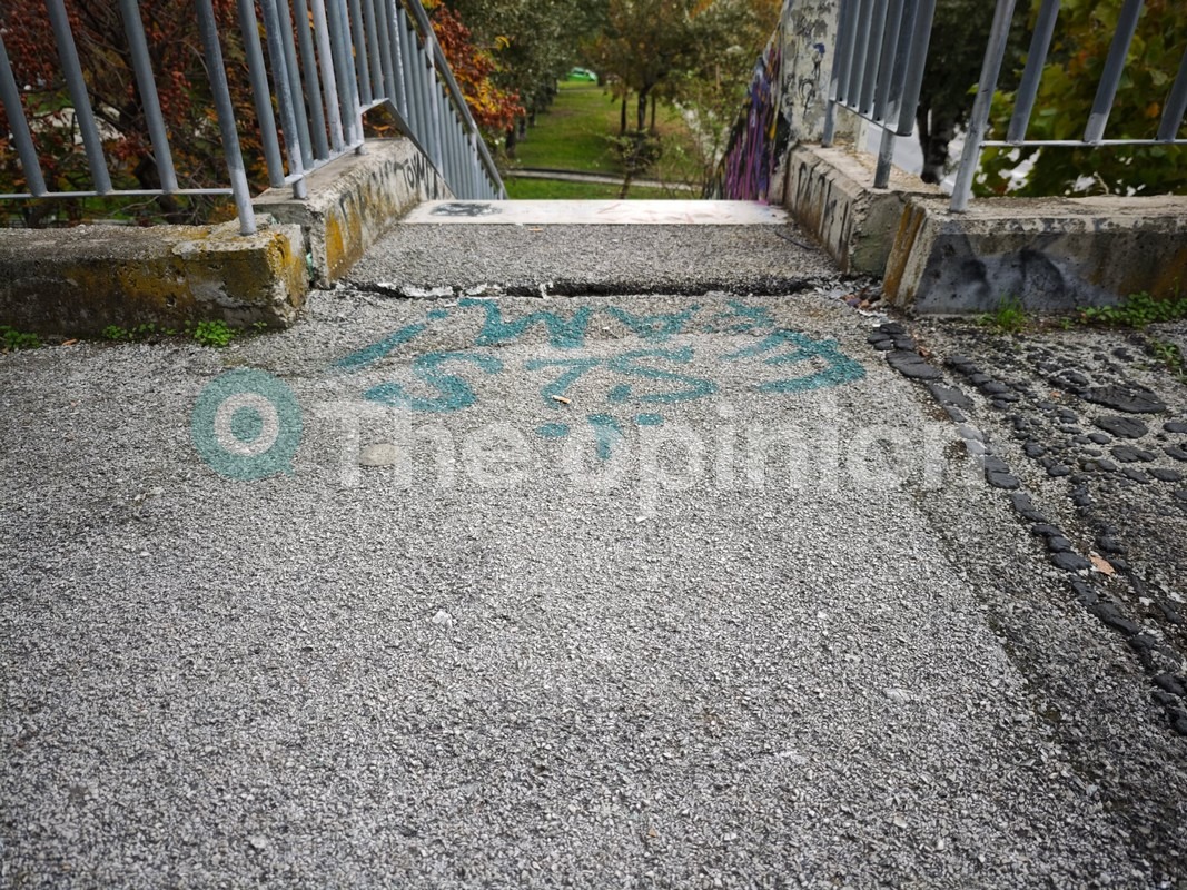 Εικόνα πλήρους εγκατάλειψης παρουσιάζει η πεζογέφυρα στη Λεωφόρο Μεγάλου Αλεξάνδρου, η οποία συνδέει την παραλία της Θεσσαλονίκης με το Φάληρο και απέχει μόλις λίγα μέτρα από το κέντρο της πόλης. Μια γέφυρα που κατασκευάστηκε τη δεκαετία του 1970, σήμερα φαίνεται να έχει αφεθεί στη φθορά του χρόνου.