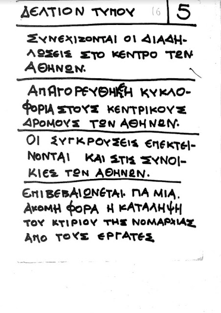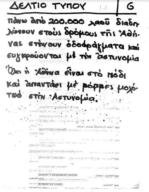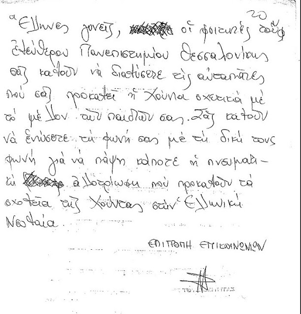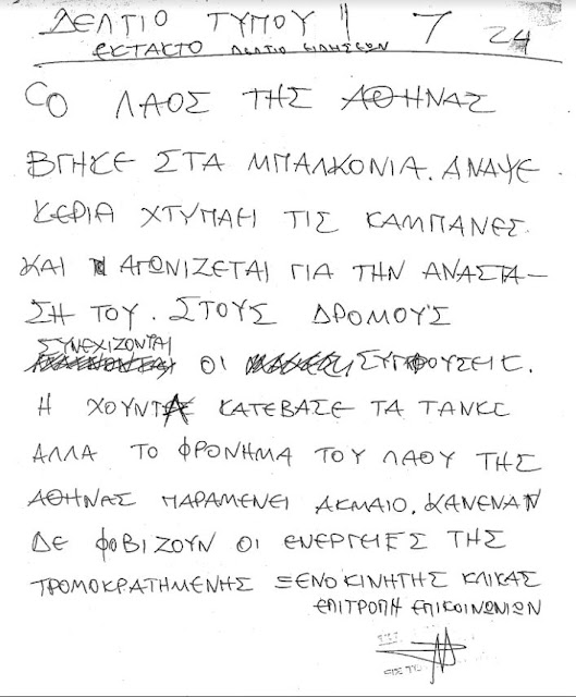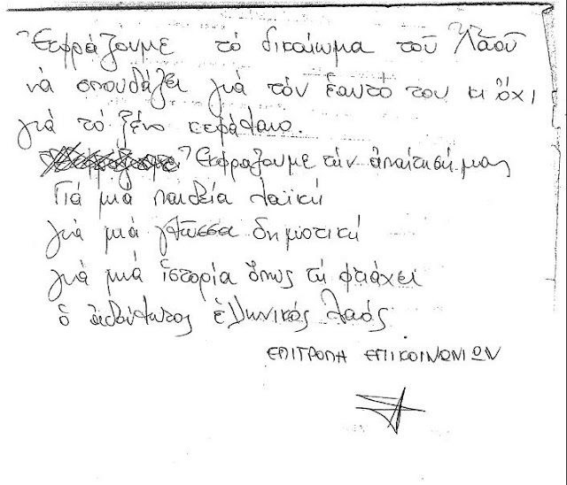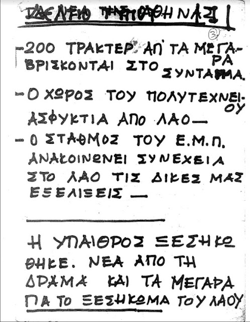 Συχνά, αναμεταδίδονταν και το ακόλουθο μήνυμα, που έδινε και το πολιτικό στίγμα της κατάληψης αλλά και τους στόχους των έγκλειστων φοιτητών: