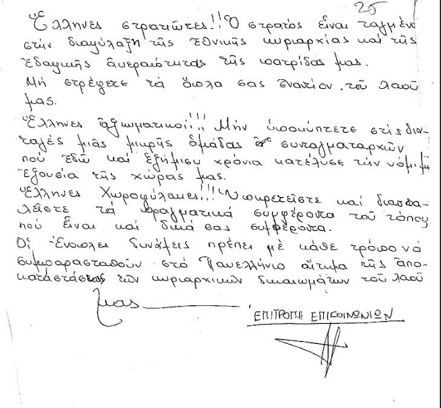 ” Έλληνες, σας μιλά το ελεύθερο Πανεπιστήμιο Θεσσαλονίκης. Μεταδίδουμε στους 1450 χιλιοκύκλους ή 210 μ. περίπου. Για 24 ώρες κρατάμε στα χέρια μας το κτίριο του Πολυτεχνείου Θεσσαλονίκης. Έλληνες, ενωθήτε μαζί μας στον κοινό αγώνα ενάντια στη φασιστική χούντα που οδήγησε τη χώρα μας στο γενικό ξεπούλημα. Η ώρα έφτασε για το γκρέμισμα της ξενοκίνητης χούντας που αντιμετωπίζοντας την καθολική αντίθεση του λαού προσπαθεί να παρατείνει τη ζωή της με διάφορες γελοίες μεταμορφώσεις“.