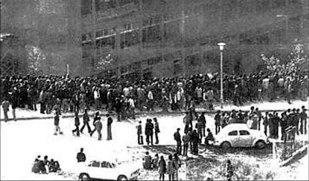 Φοιτητές από άλλες σχολές του ΑΠΘ μπροστά στην Πολυτεχνική Σχολή για να συμπαρασταθούν στους έγκλειστους της εξέγερσης του Πολυτεχνείου στη Θεσσαλονίκη