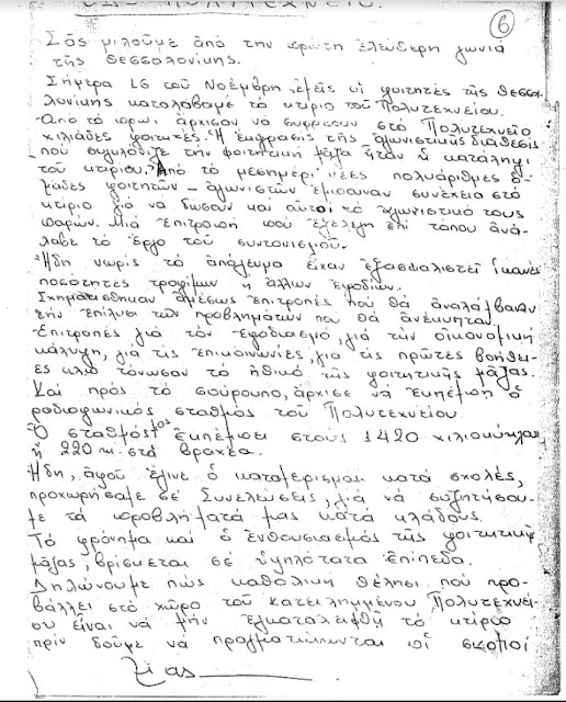 «Σας μιλούμε από την πρώτη ελεύθερη γωνιά της Θεσσαλονίκης. Σήμερα 16 Νοέμβρη εμείς οι φοιτητές της Θεσσαλονίκης καταλάβαμε το κτίριο του Πολυτεχνείου. Από το πρωί άρχισαν να συρρέουν στο Πολυτεχνείο χιλιάδες φοιτητές. Η έκφραση της αγωνιστικής διάθεσης που συγκλόνιζε τη φοιτητική μάζα ήταν η κατάληψη του κτιρίου. Από το μεσημέρι νέες πολυάριθμες ομάδες φοιτητών – αγωνιστών έμπαιναν συνέχεια στο κτίριο για να δώσουν κι αυτοί το αγωνιστικό τους παρών. Μια επιτροπή που εξελέγη επί τόπου ανάλαβε το έργο του συντονισμού. Ήδη νωρίς το απόγευμα είχαν εξασφαλιστεί ικανές ποσότητές τροφίμων και άλλων εφοδίων. Σχηματίστηκαν αμέσως επιτροπές που θα αναλάμβαναν την επίλυση των προβλημάτων που θα ανέκυπταν. Επιτροπές για τον εφοδιασμό, για την οικονομική κάλυψη, για τις επικοινωνίες, τις πρώτες βοήθειες κλπ τόνωσαν το ηθικό της φοιτητικής μάζας. Και προς το σούρουπο άρχισε να εκπέμπει ο ραδιοφωνικός σταθμός του Πολυτεχνείου. Ο σταθμός μας εκπέμπει στους 1420 χιλιόκυκλους ή 220 μ. στα βραχέα. Ήδη, αφού έγινε ο καταμερισμός κατά σχολές, προχωρήσαμε σε συνελεύσεις για να συζητήσουμε τα προβλήματά μας κατά κλάδους. Το φρόνημα και ο ενθουσιασμός της φοιτητικής μάζας βρίσκεται σε υψηλότατα επίπεδα. Δηλώνουμε πως καθολική θέληση που προβάλλει στο χώρο του κατειλημμένου Πολυτεχνείου είναι να μην εγκαταλειφθεί το κτίριο πριν δούμε να πραγματοποιούνται οι σκοποί μας».