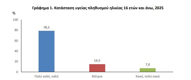 Το 78,5% των ενηλίκων δηλώνει ότι έχει πολύ καλή ή καλή υγεία, ενώ το 14,5% αξιολογεί την υγεία του ως μέτρια και μόλις το 7% την χαρακτηρίζει κακή ή πολύ κακή. Ωστόσο, η ύπαρξη χρόνιων προβλημάτων υγείας επηρεάζει περίπου ένα στα τέσσερα άτομα.