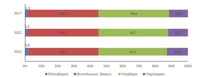 Αξίζει να σημειωθεί ότι, η ανάλυση ανά φύλο αποκαλύπτει σημαντικές διαφορές, καθώς 1 στους 2 άνδρες είναι υπέρβαρος, ενώ μεταξύ των γυναικών το ποσοστό περιορίζεται σε λίγο πάνω από 3 στις 10.